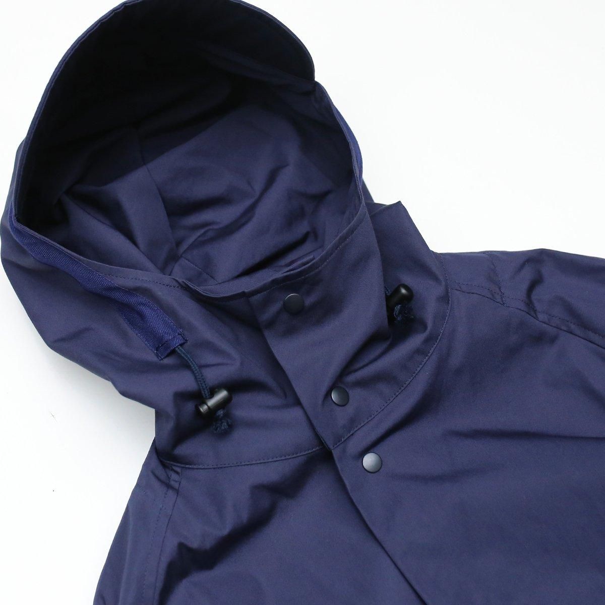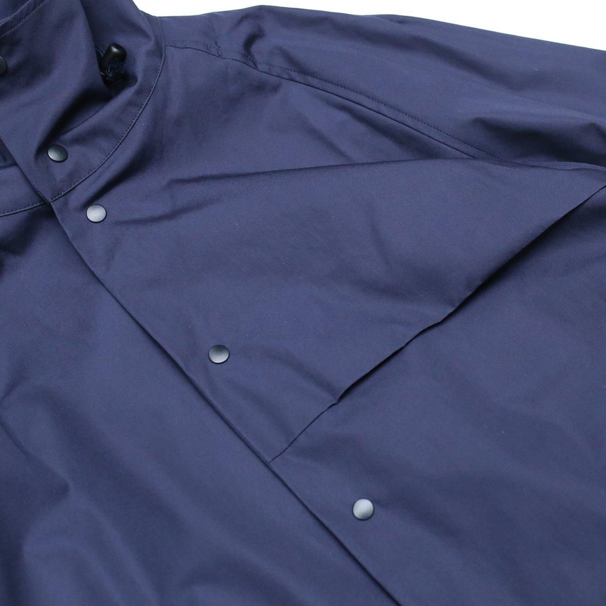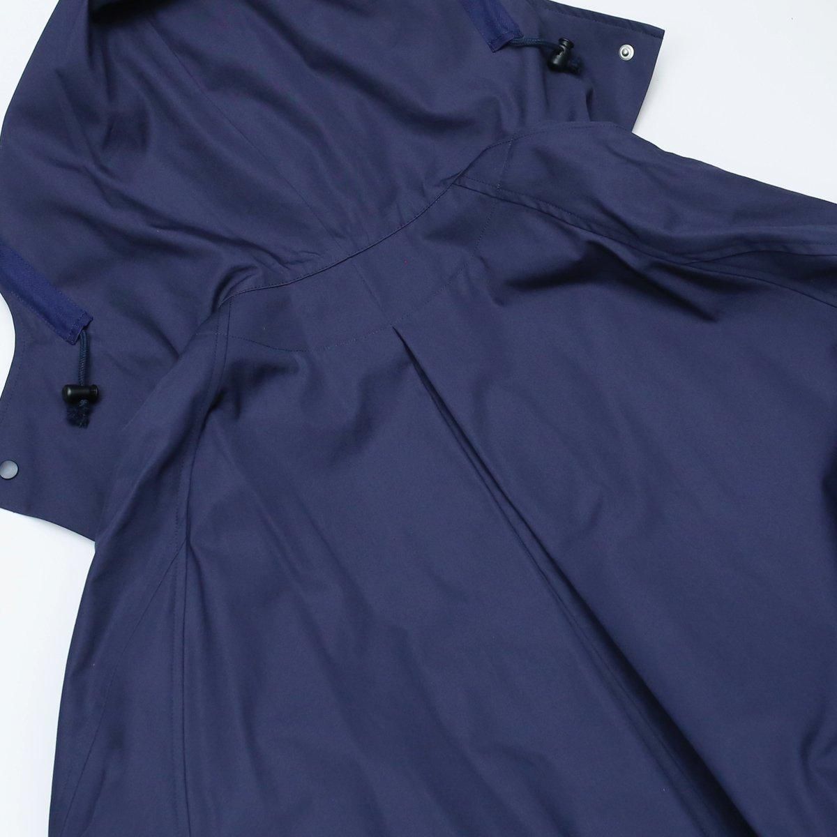 仕様でこだわったのは、フードを被った時のフィット感と形。特にフィット感は、雨を想定して水が侵入してこないよう余分な分量を削りました。ツバには厚めの芯地を入れ、しっかり形をキープさせ型崩れを防止するとともに、こちらも雨避け効果が期待できます。