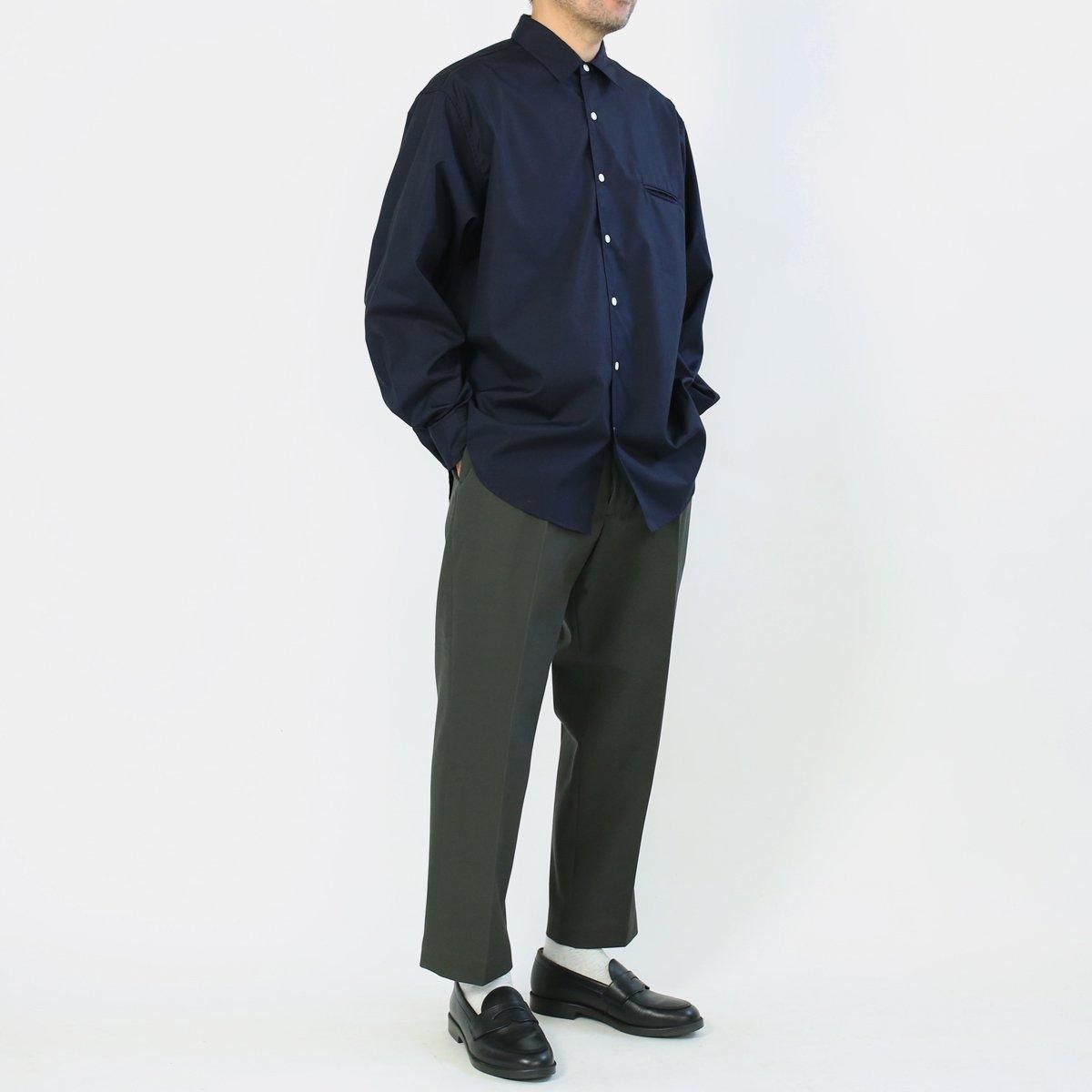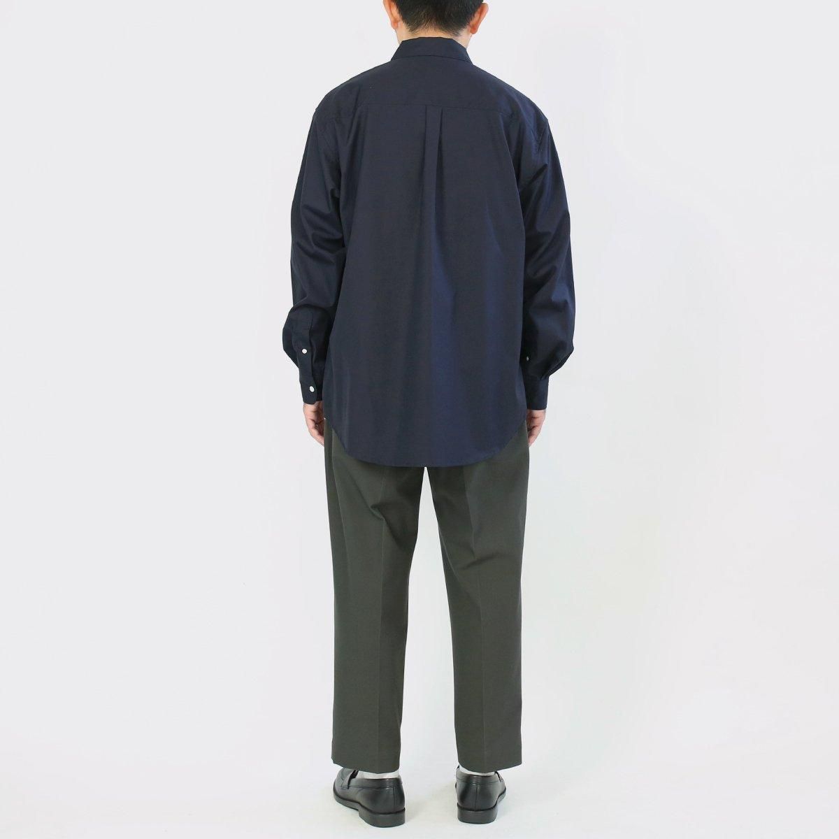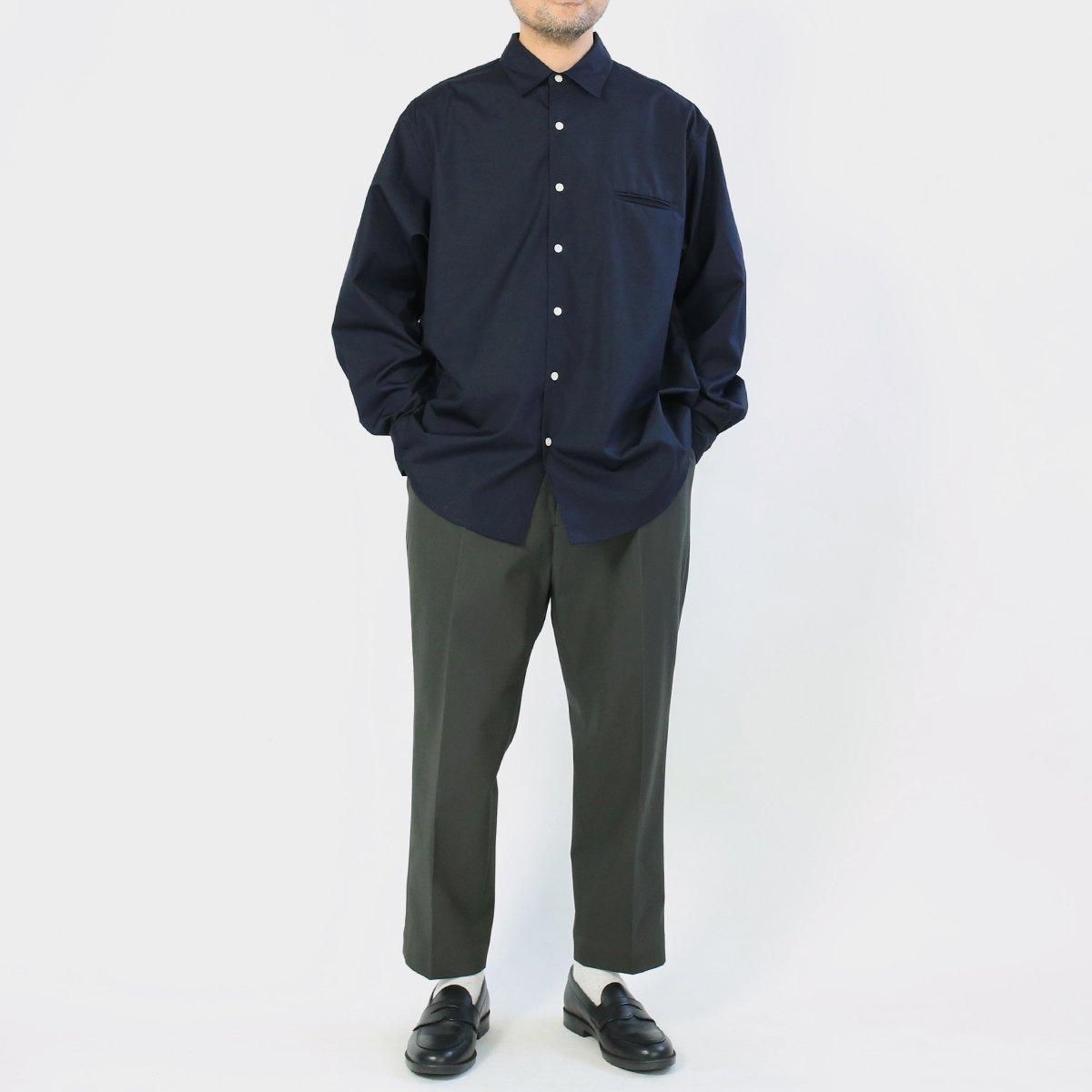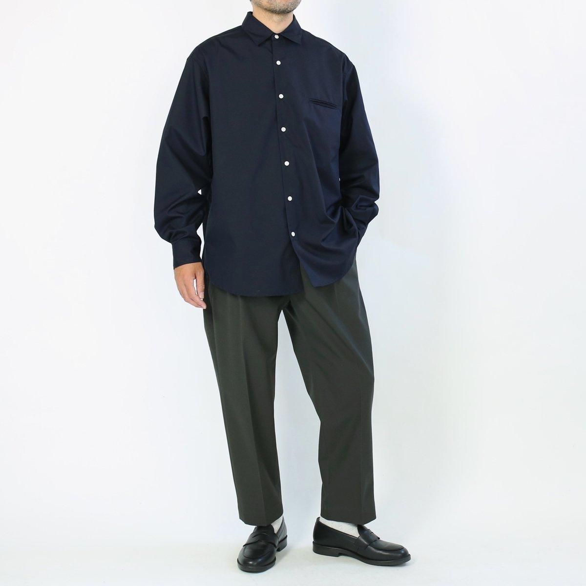 サイズ感は袖幅と身幅を少し小さく微調整しましたが、これまで通りゆったりしたサイズ感で、長袖のカットソーをインナーにしても窮屈になりません。シャツの顔となる襟型はやや小ぶりで丸みを削いだシャープな襟。さりげなく胸に付いたポケットは縫製が難しく手間のかかる両玉縁ポケット。