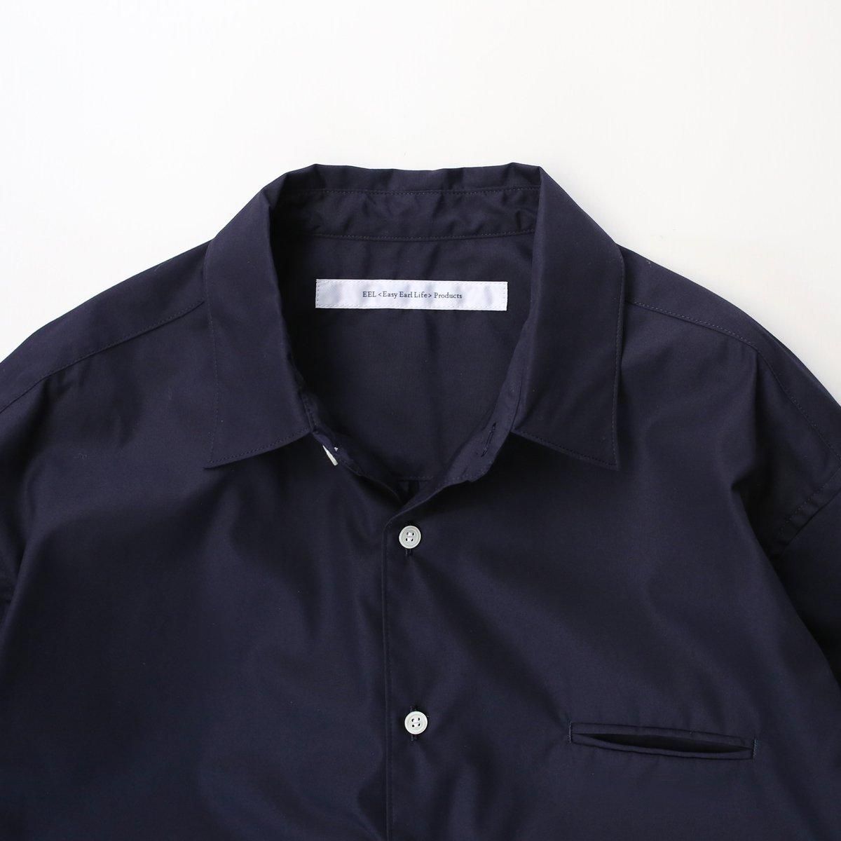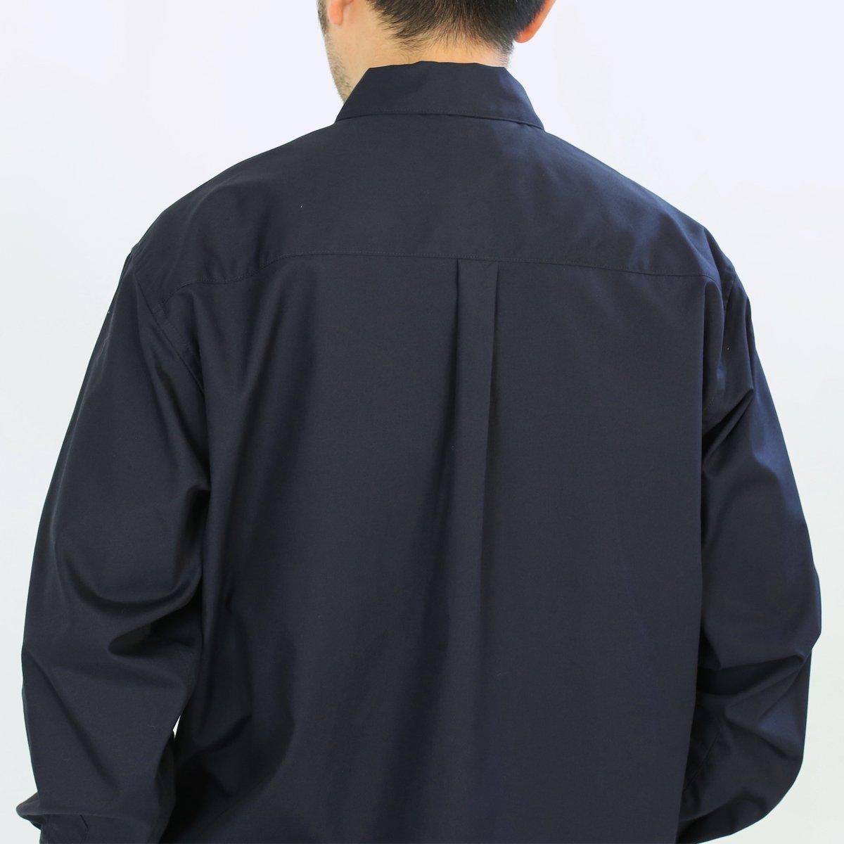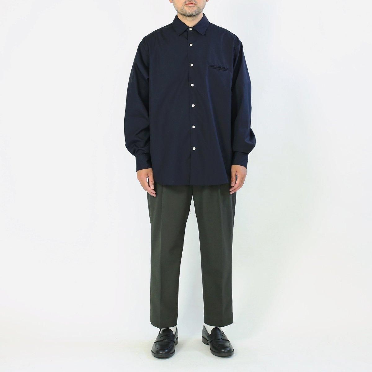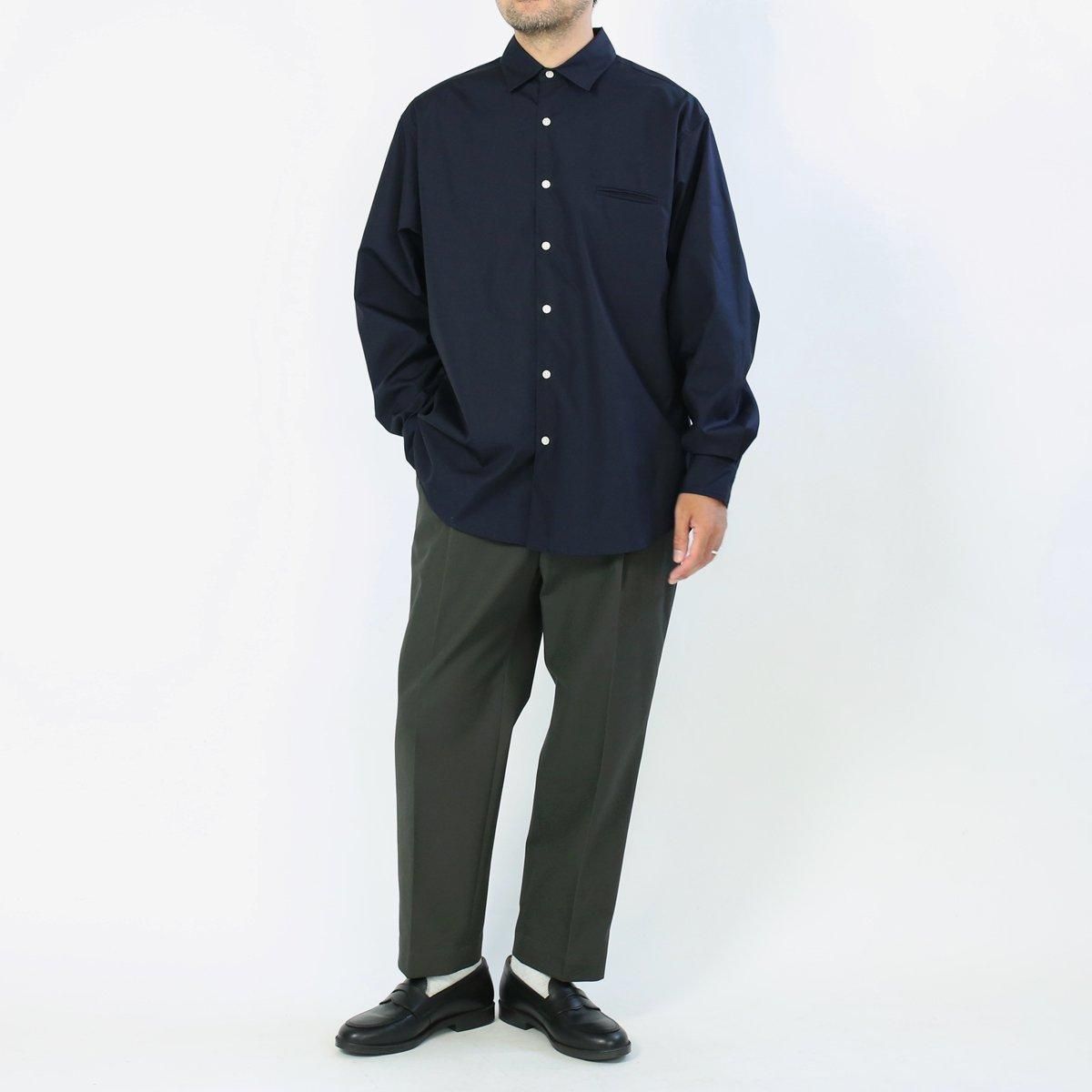 サイズ感は袖幅と身幅を少し小さく微調整しましたが、これまで通りゆったりしたサイズ感で、長袖のカットソーをインナーにしても窮屈になりません。シャツの顔となる襟型はやや小ぶりで丸みを削いだシャープな襟。さりげなく胸に付いたポケットは縫製が難しく手間のかかる両玉縁ポケット。