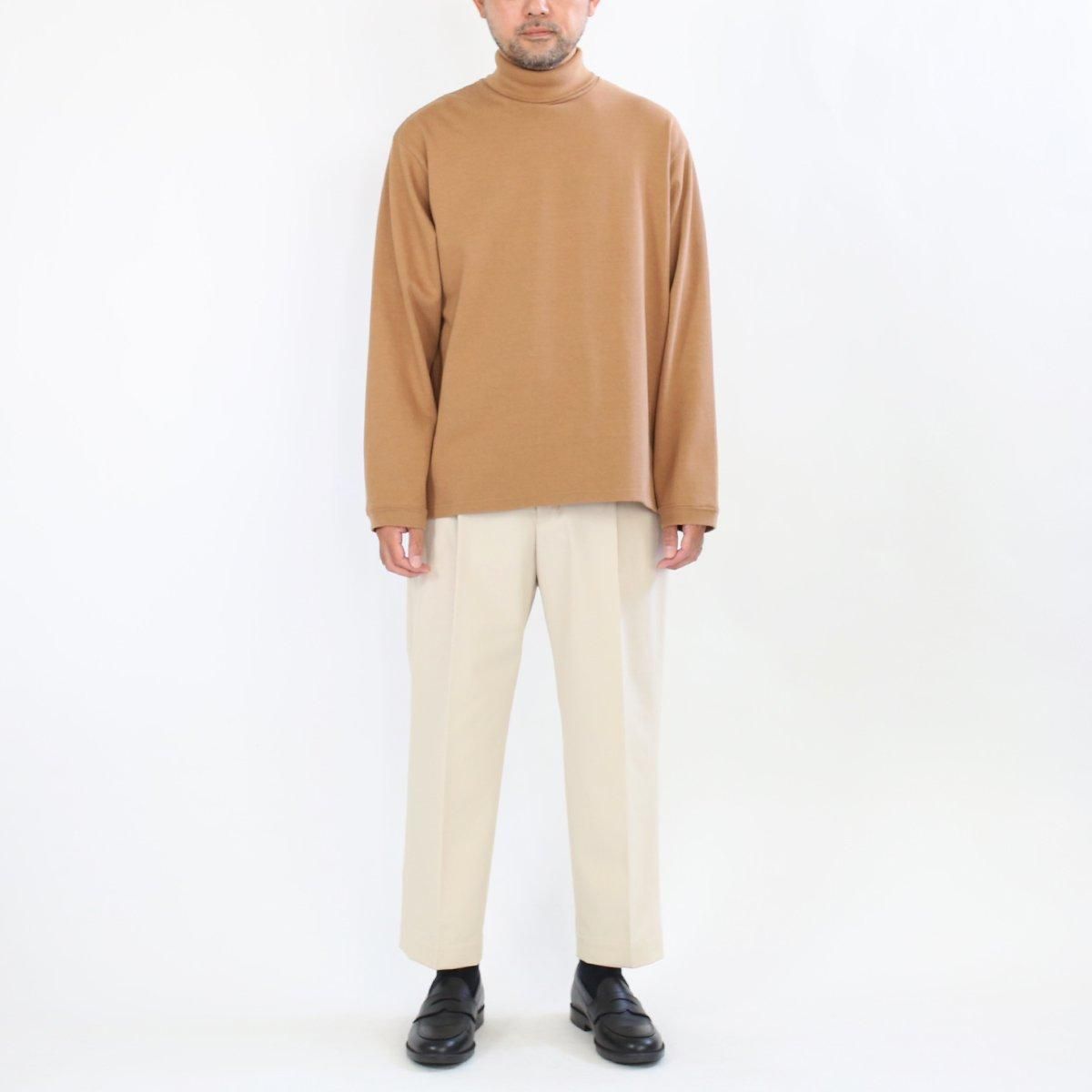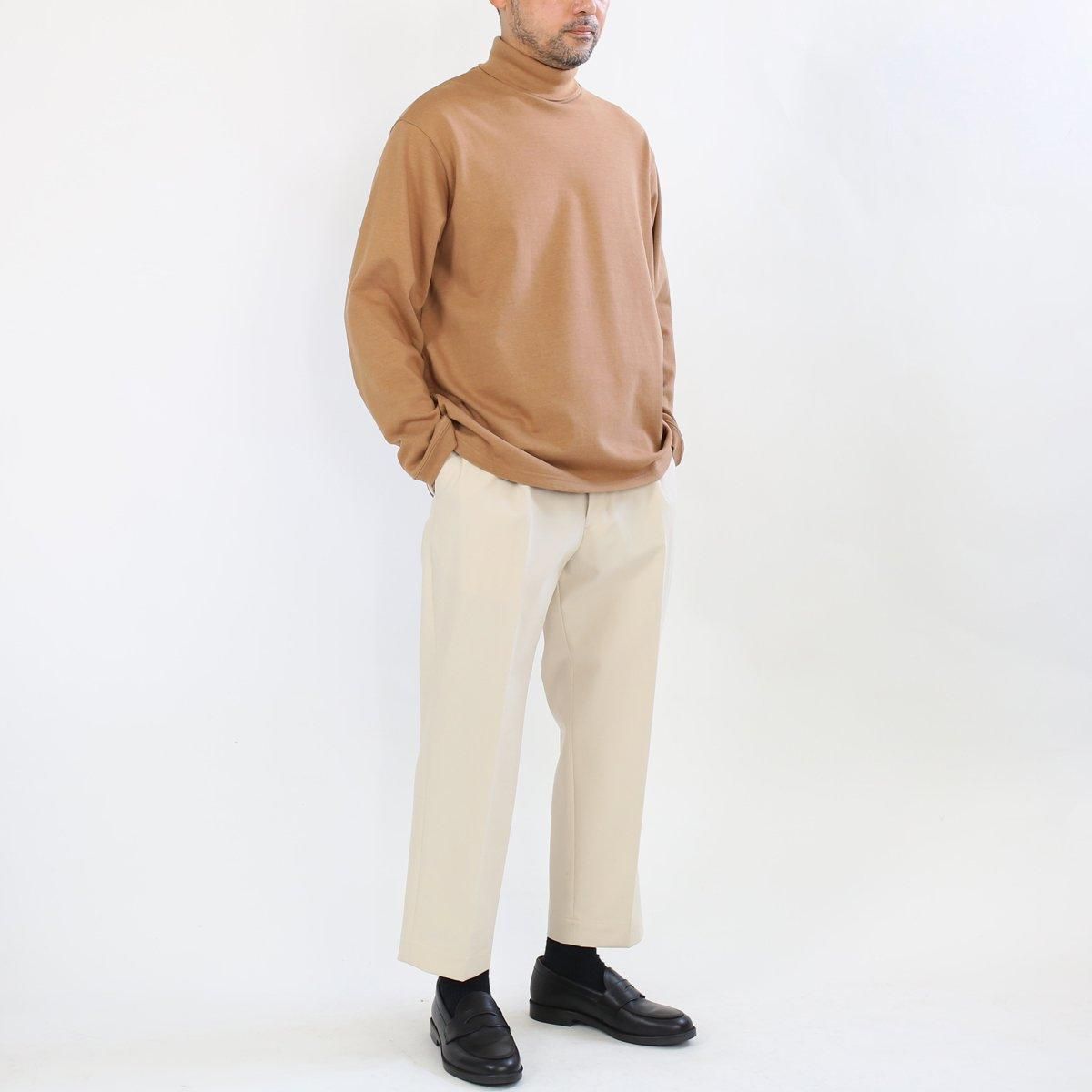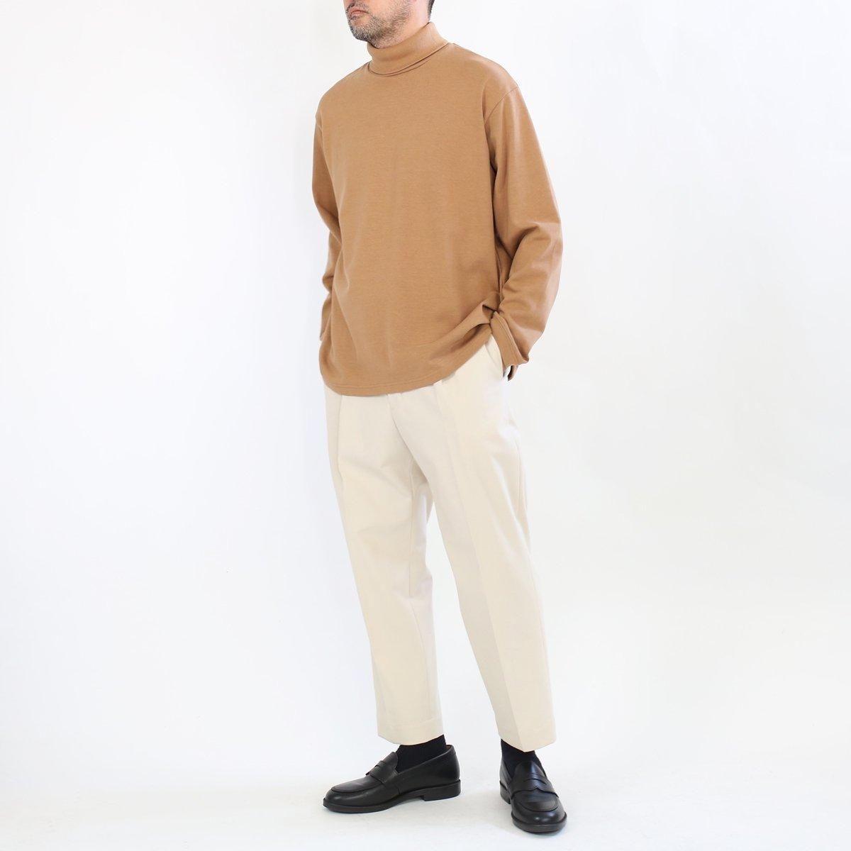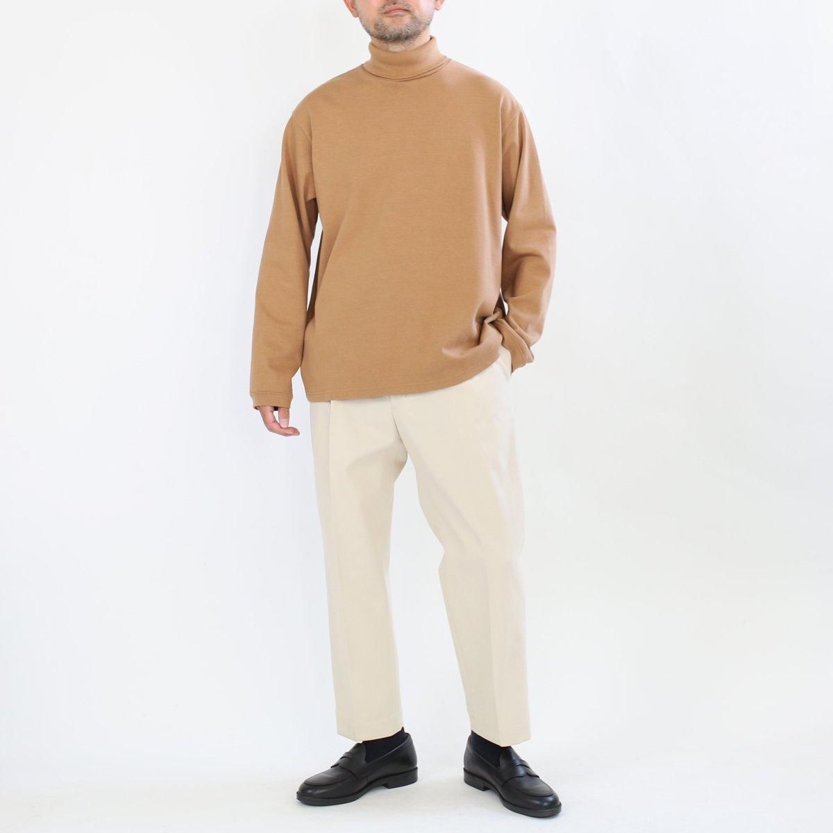ウールのタートルネックも良いですが、気兼ねなく洗濯できるコットン素材は、買い足してストックしておきたいアイテムです。