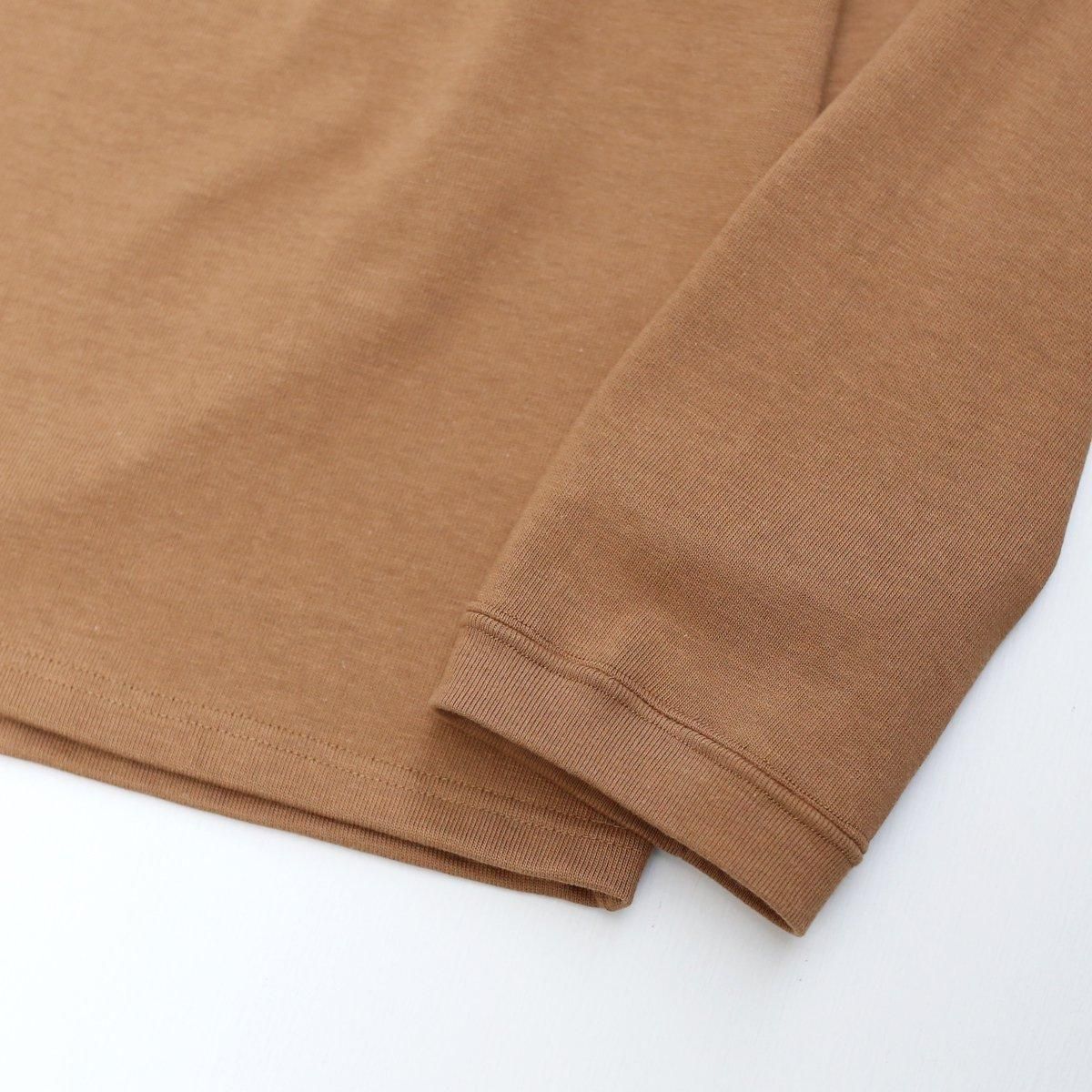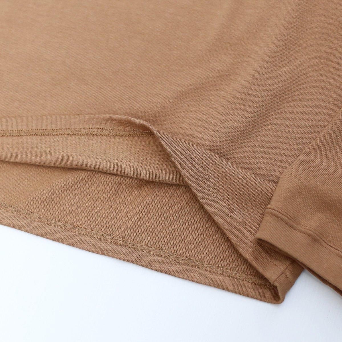 2年前に販売した生地は、インレーという薄手のミニ裏毛を使いましたが、今回の生地は綿の繊維に水分をたっぷりと含ませた、しっとりモチっとした肌触りが特徴。薄手ではなく、しっかり厚みのある中肉で、程よい張り感と柔らかさを兼ね備えた着心地の良い素材です。(参考までに、これまで継続的に販売してきたセイロンティーに近い生地感で、もう少し薄手です。)