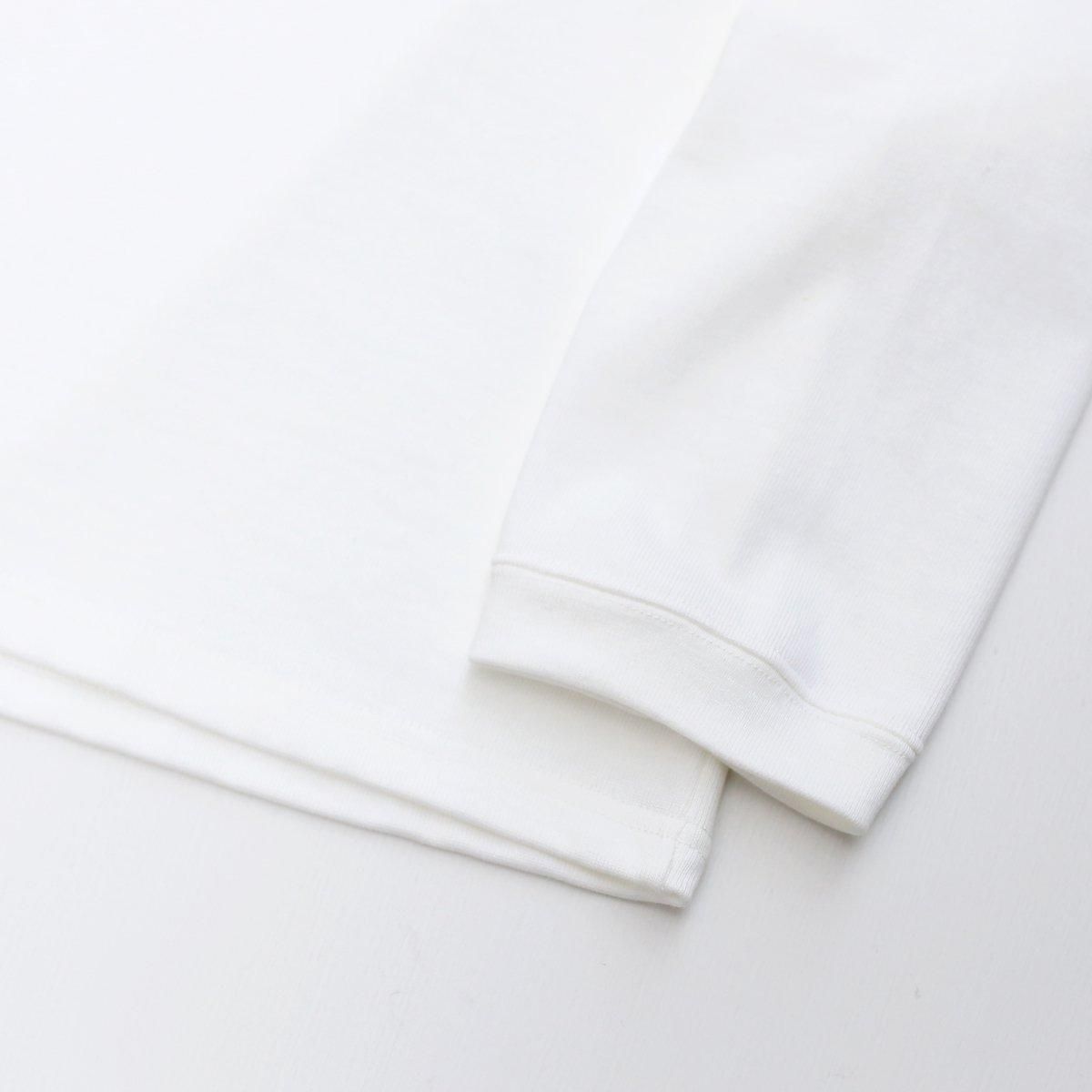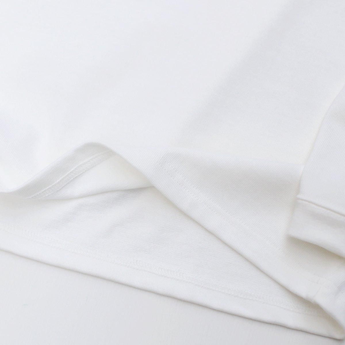 2年前に販売した生地は、インレーという薄手のミニ裏毛を使いましたが、今回の生地は綿の繊維に水分をたっぷりと含ませた、しっとりモチっとした肌触りが特徴。薄手ではなく、しっかり厚みのある中肉で、程よい張り感と柔らかさを兼ね備えた着心地の良い素材です。(参考までに、これまで継続的に販売してきたセイロンティーに近い生地感で、もう少し薄手です。)