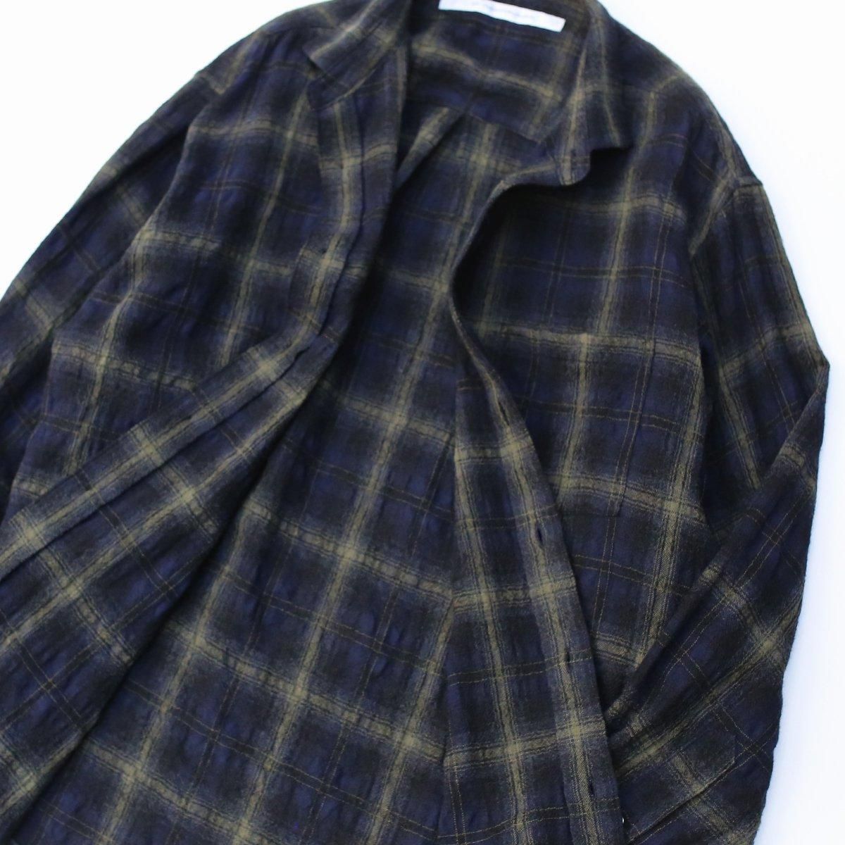 タンブラー加工を施したウールコットンのガーゼ生地は、ウールとコットンの縮率の差異により、シアサッカーのような凹凸が生まれます。温かみのある表情豊かな質感、ふっくらした肌触りと柔らかさが特徴です。決して薄手ではないものの、ガーゼ組織特有の甘織りにより、とても軽くて着心地が抜群です。