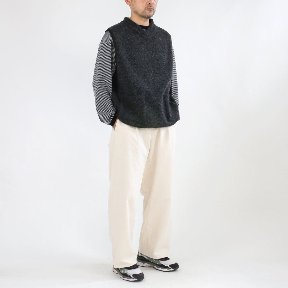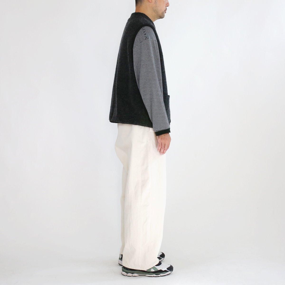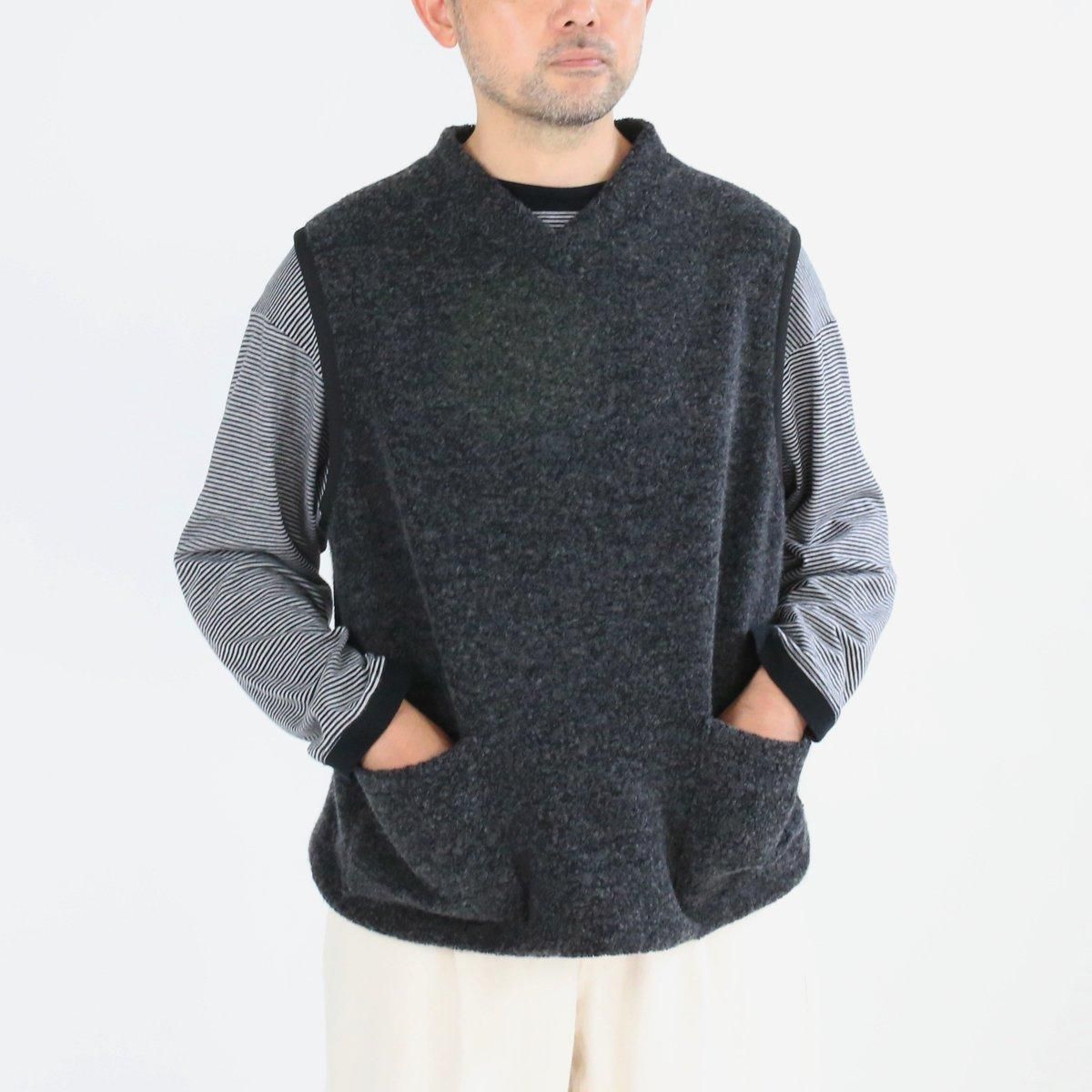 浅いVネックの襟は、インナーが少し覗くくらいに設定。クルーネックはもちろん、タートルネックやシャツをインナーにあわせて重ね着を楽しんでください。前身頃に付いたパッチポケットは、ハンドウォーマーとしても重宝します。