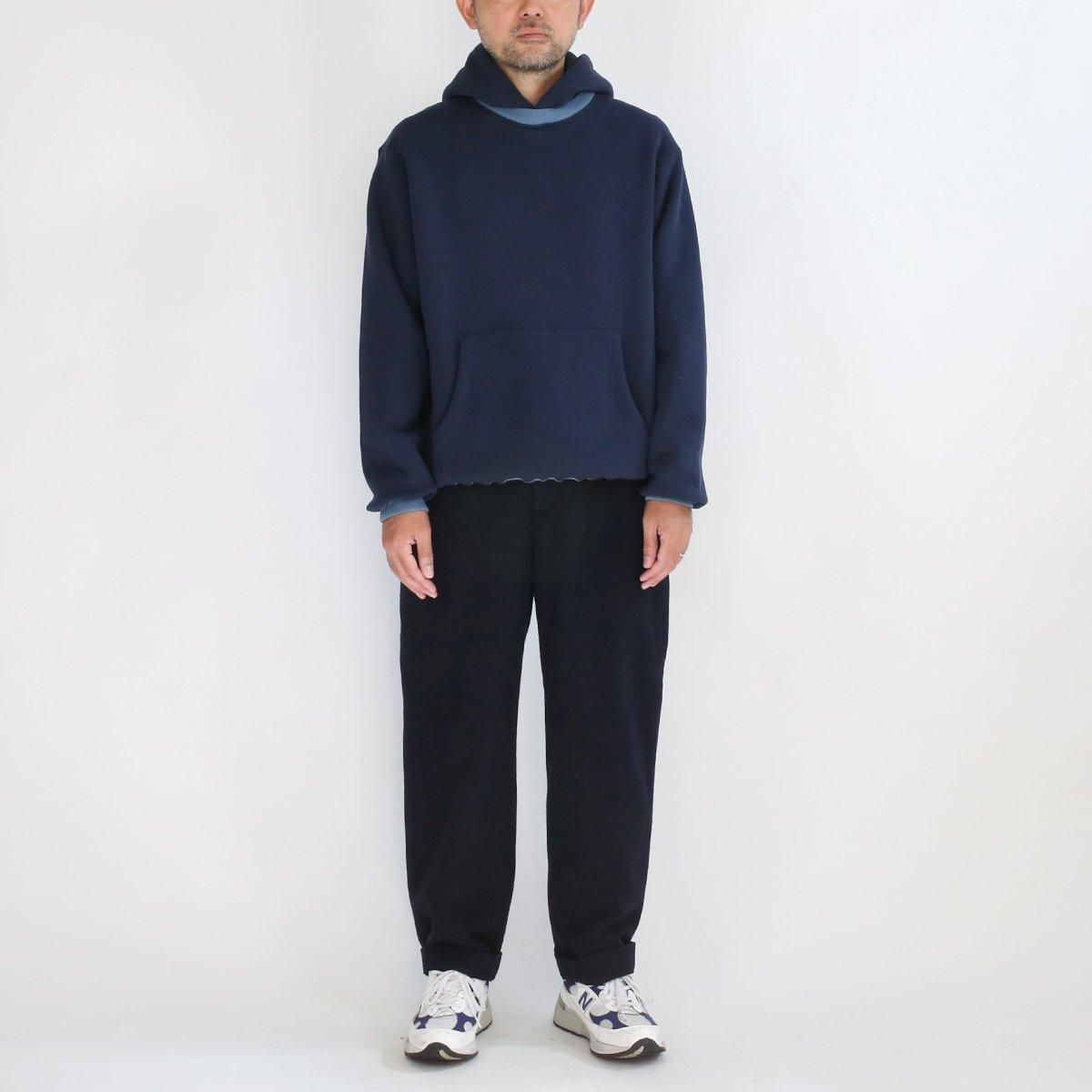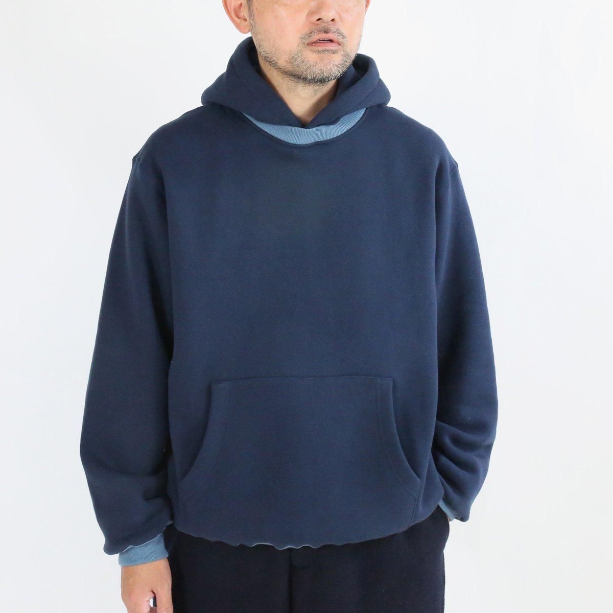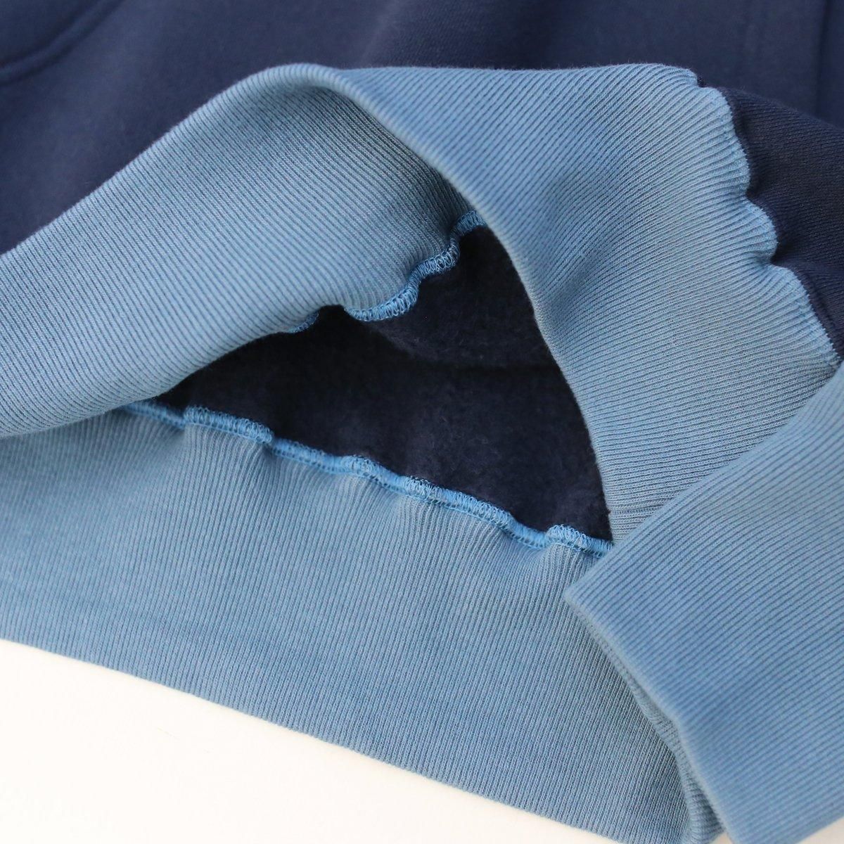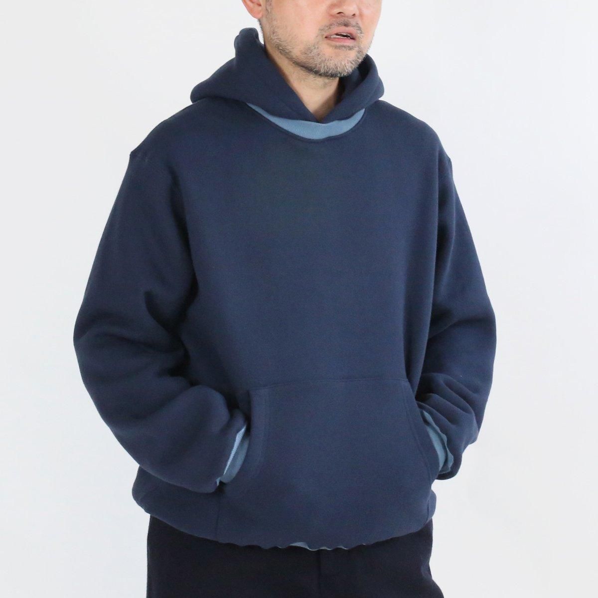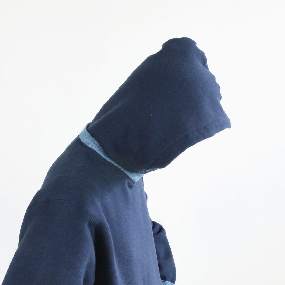 一見するとわかりにくいですが、襟ぐりの内側にフードを縫い付けています。昨年、僕がフーディーにクルーネックスウェットを上から重ね着した時、首周りにフードが密着して、とても暖かいと感じたことがきっかけで製作に至りました。通常のフーディーよりも内側に縫い付けてある分、密着度が高く保温性が高まります。