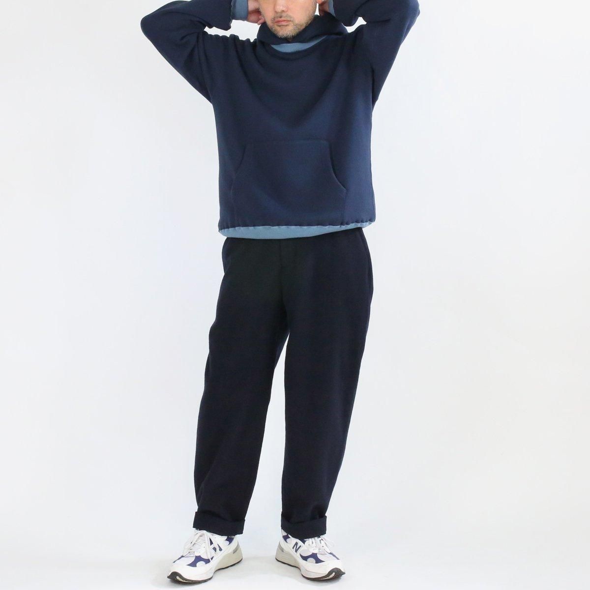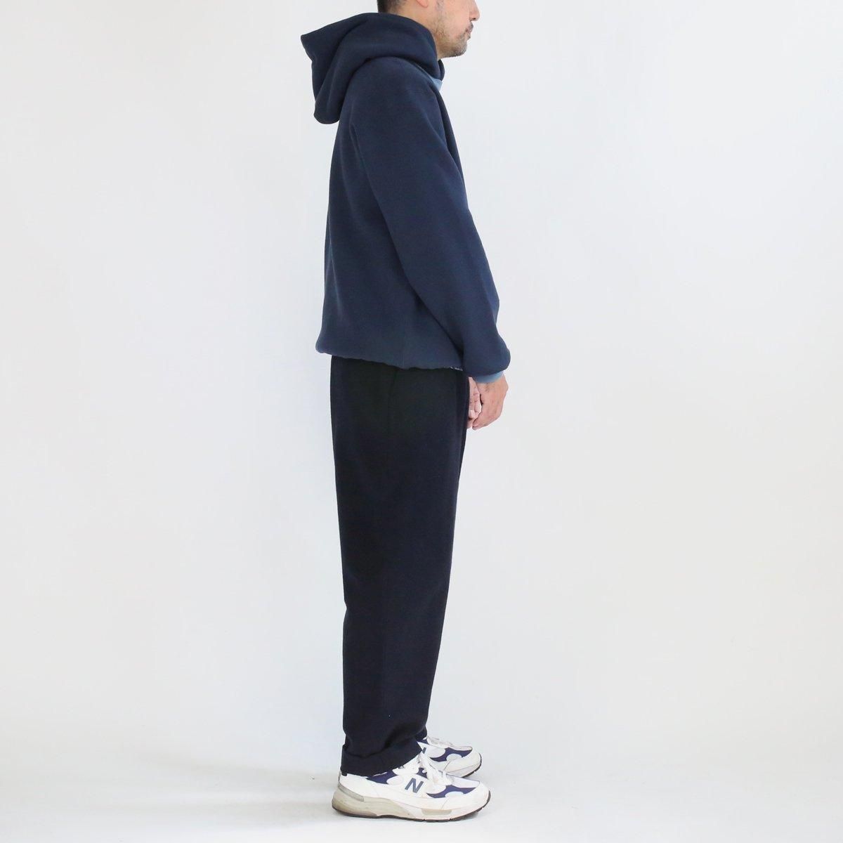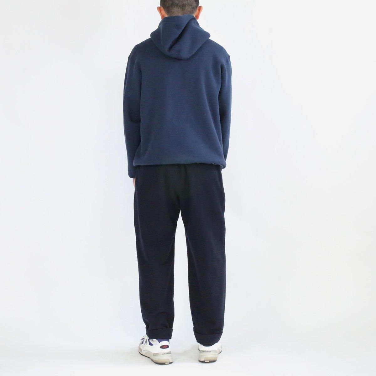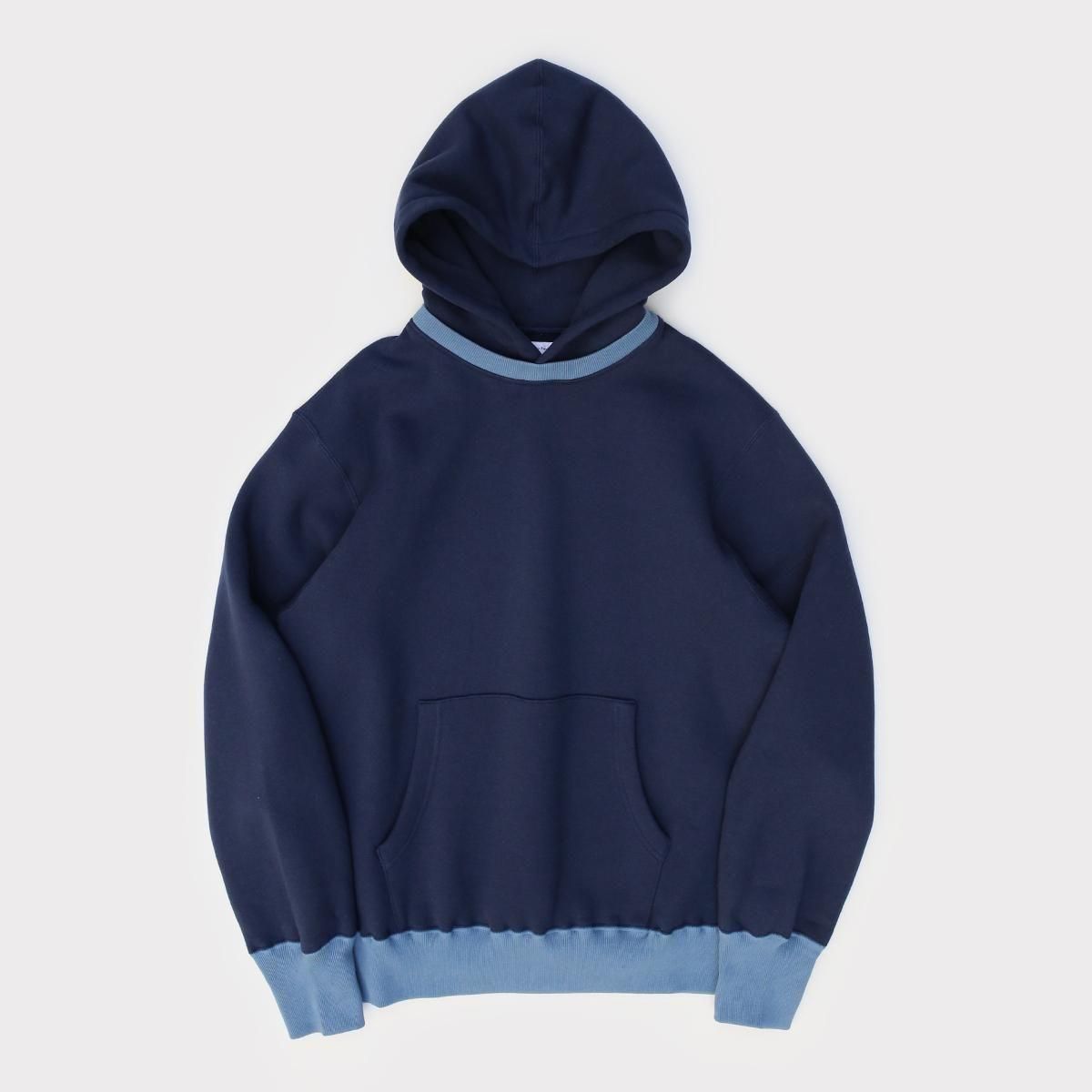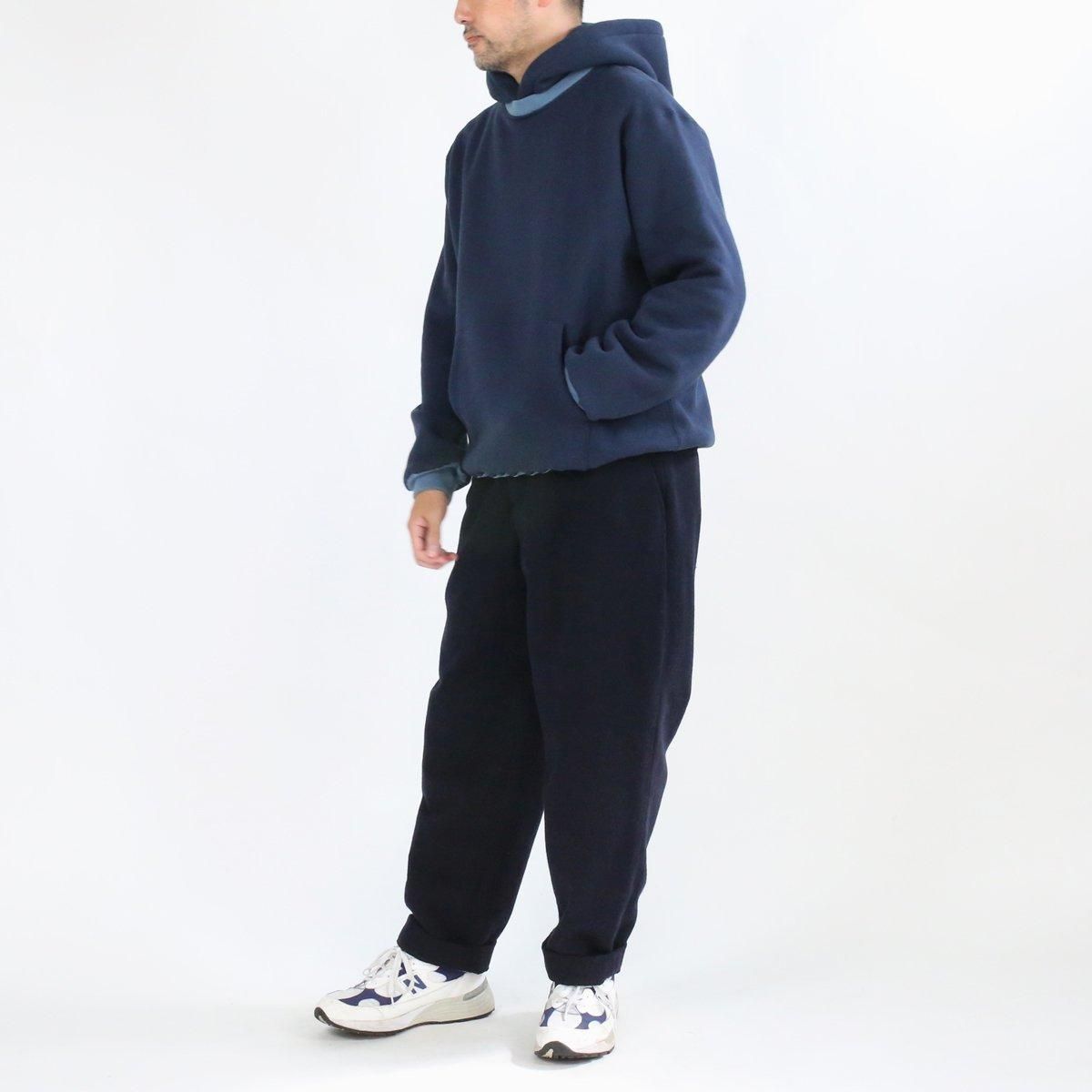 一見するとわかりにくいですが、襟ぐりの内側にフードを縫い付けています。昨年、僕がフーディーにクルーネックスウェットを上から重ね着した時、首周りにフードが密着して、とても暖かいと感じたことがきっかけで製作に至りました。通常のフーディーよりも内側に縫い付けてある分、密着度が高く保温性が高まります。