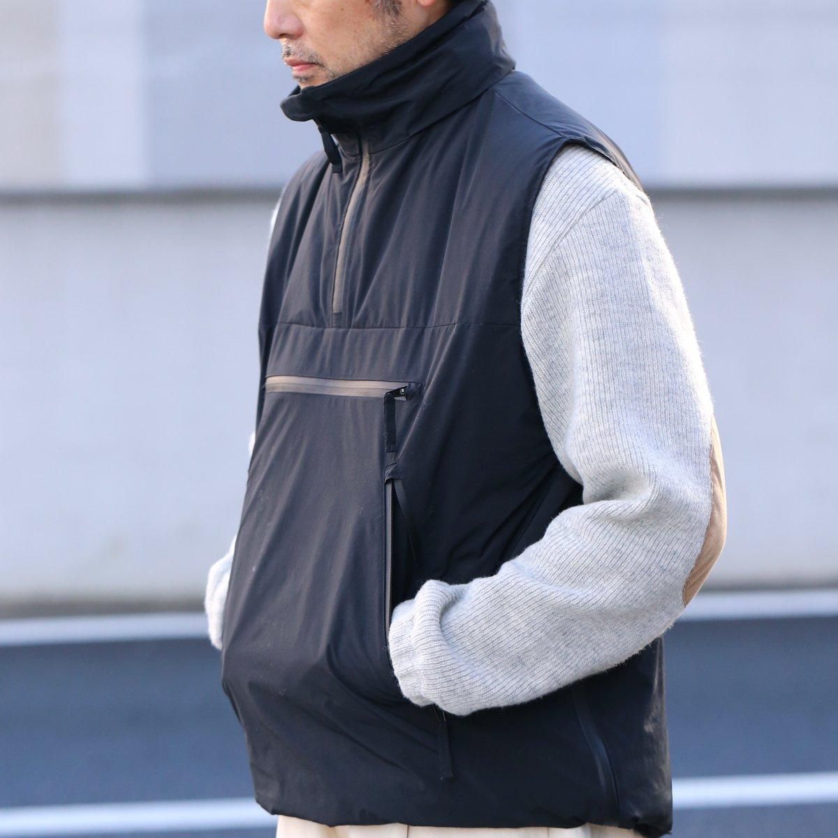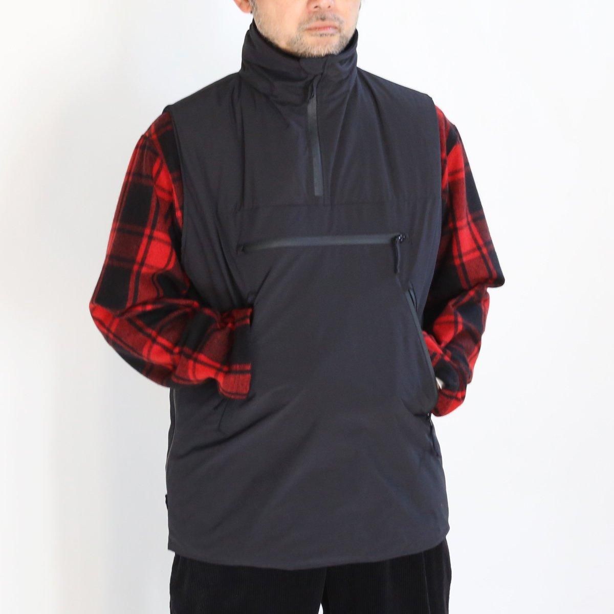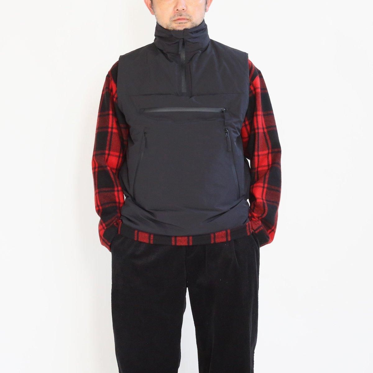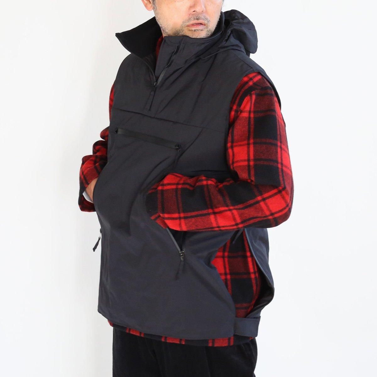 イギリス軍を代表するアイテム「PCS Thermal Smock」を見直し、ベストへアップグレードした一着。オリジナルに忠実なショート丈やサイズ感はそのままに、表生地をEEL Productsオリジナルファブリックのポリエステル/ナイロンを使用し別注。 張りのある独特の風合いと光沢のないマットで落ち着いた生地感が特徴。軽さの中に強度と耐久性をもち、撥水性も兼ね備えています。