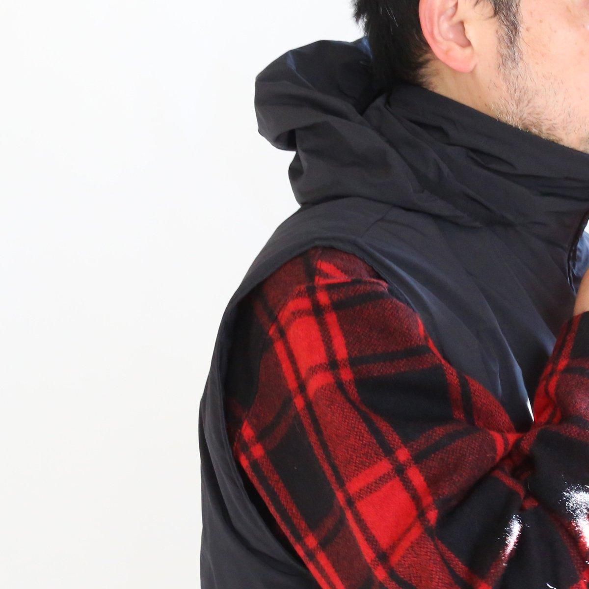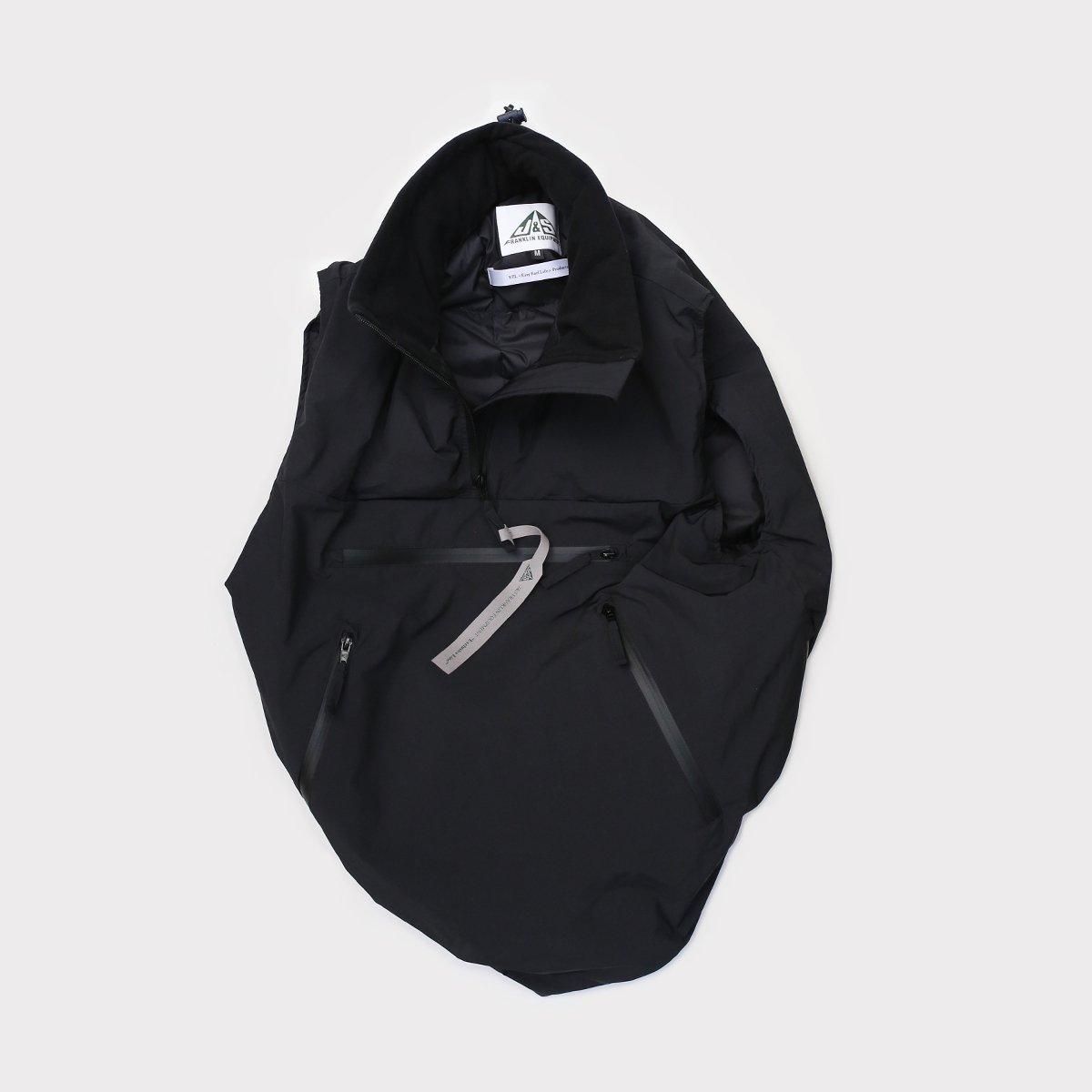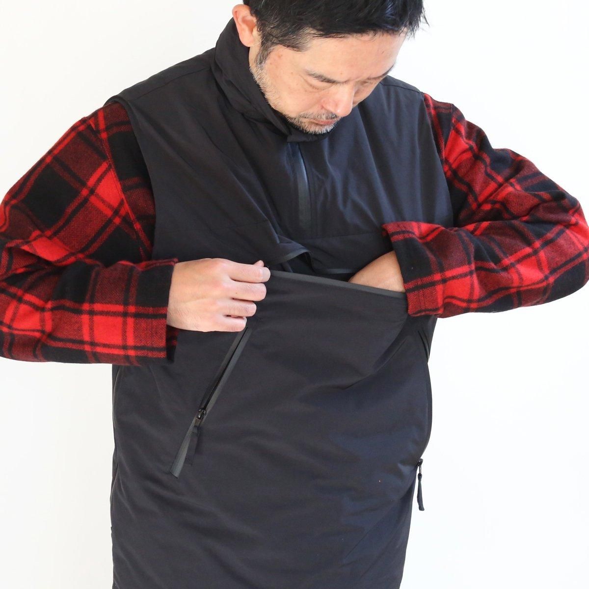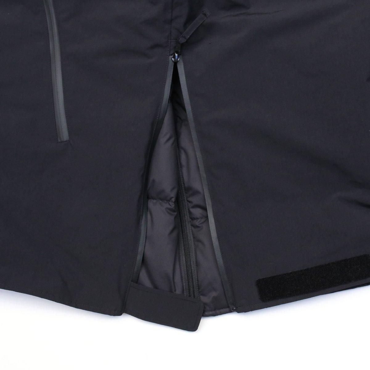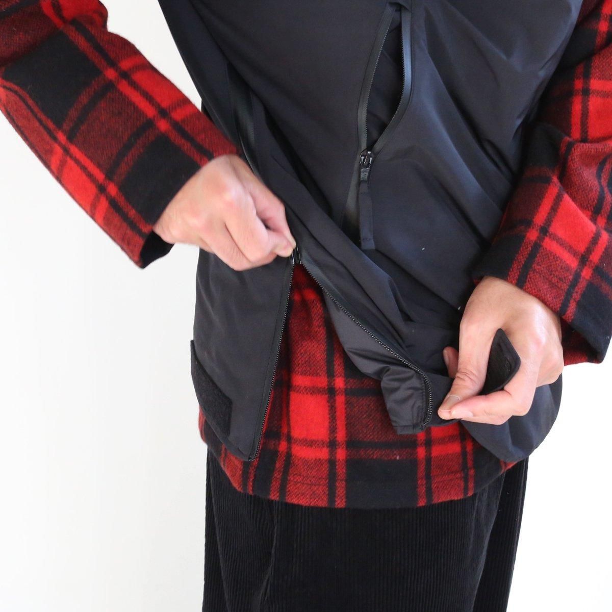 衿にフードが内臓され急な雨風を防ぎ、襟裏には保温性の高いフリースを、撥水性のある止水ファスナーを使用し、機能性の高い仕様にまとまっています。プルオーバータイプの弱点である着脱のしづらさを、両脇に付いた裾のベロクロを外し、ファスナーを開けることで弱点を解消し、スムーズな着脱を可能にしました。