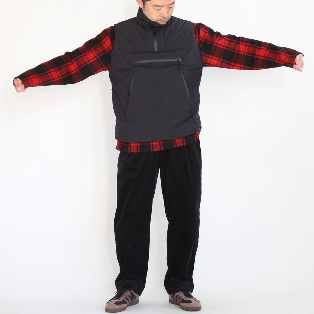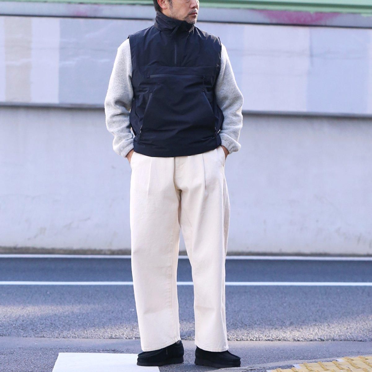 サイズ感は、程良いゆとりのスッキリしたシルエット。両脇のベロクロを絞り、裾を1折りして着丈を調節することもできます。パンツのシルエットに合わせて着丈を短くしたり、長くしたり色々なスタイリングを楽しめます。