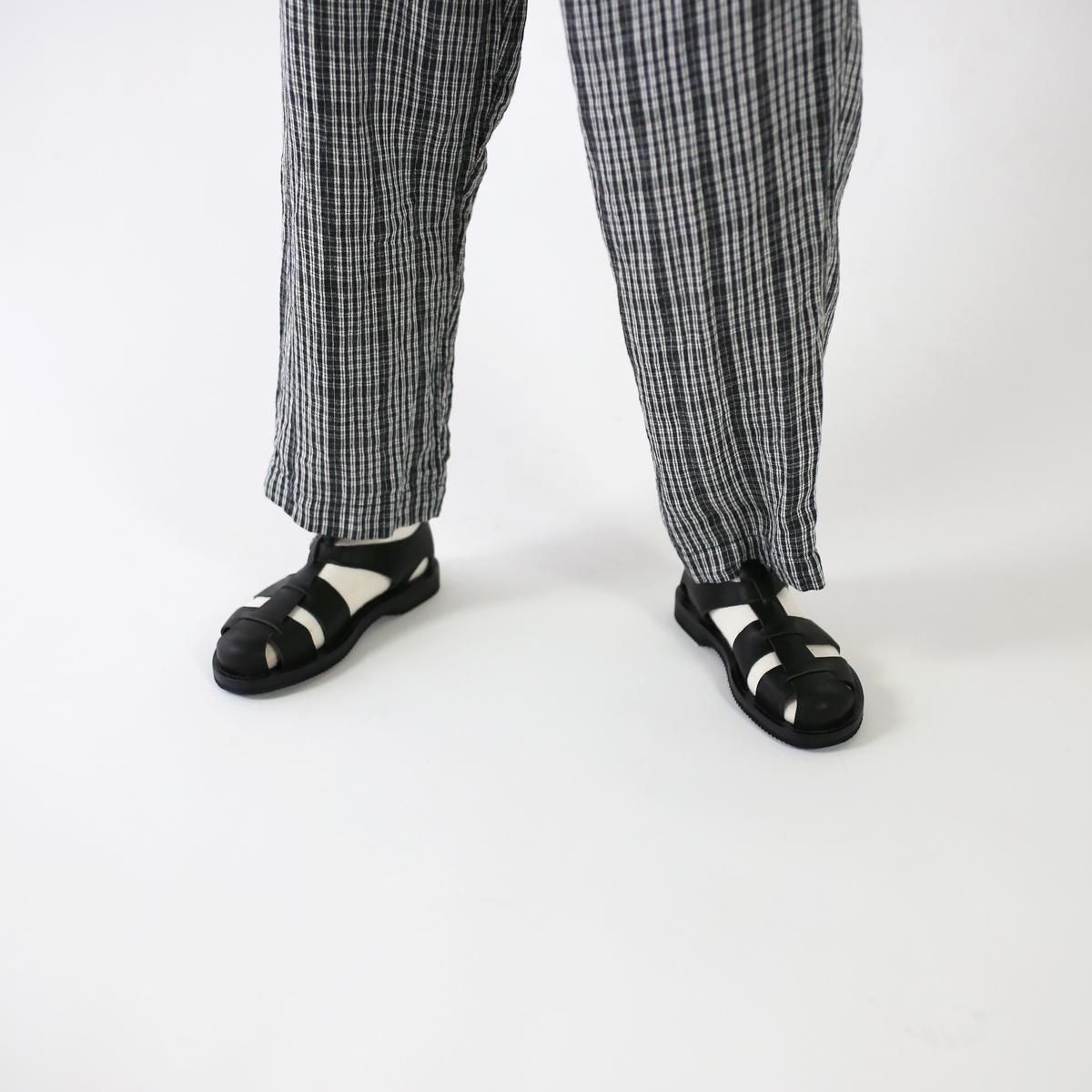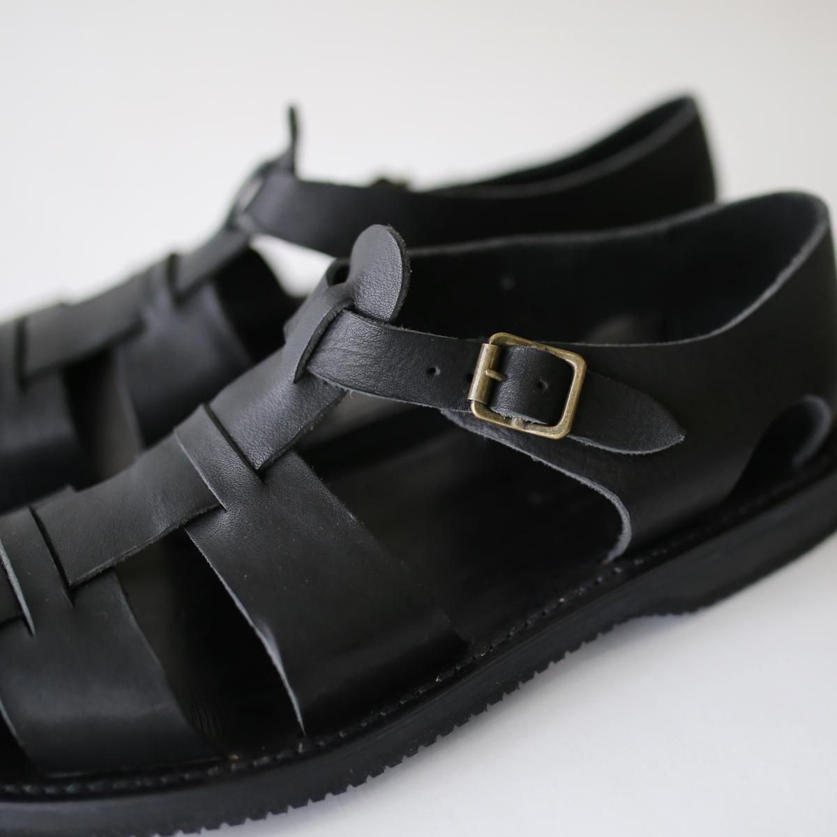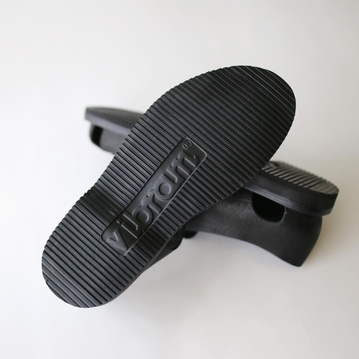 レザーサンダルを素足で履くと足裏にペタペタと張り付くことがありますが、中底面のレザーを船形のように湾曲させることで、この問題を解消。新品の状態からでも足に沿ったフィット感があります。さらに、甲高の足に馴染み易いよう甲部分の革の縁を薄くすき足あたりが優しくストレスなく歩行できます。歩きやすさを考慮して足首から踵は一体型のストラップでホールドされ、しっかりとフィット感があるので長時間履いても疲れにくい仕様です。