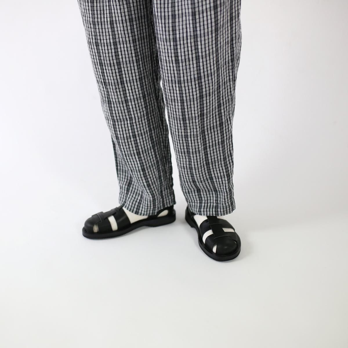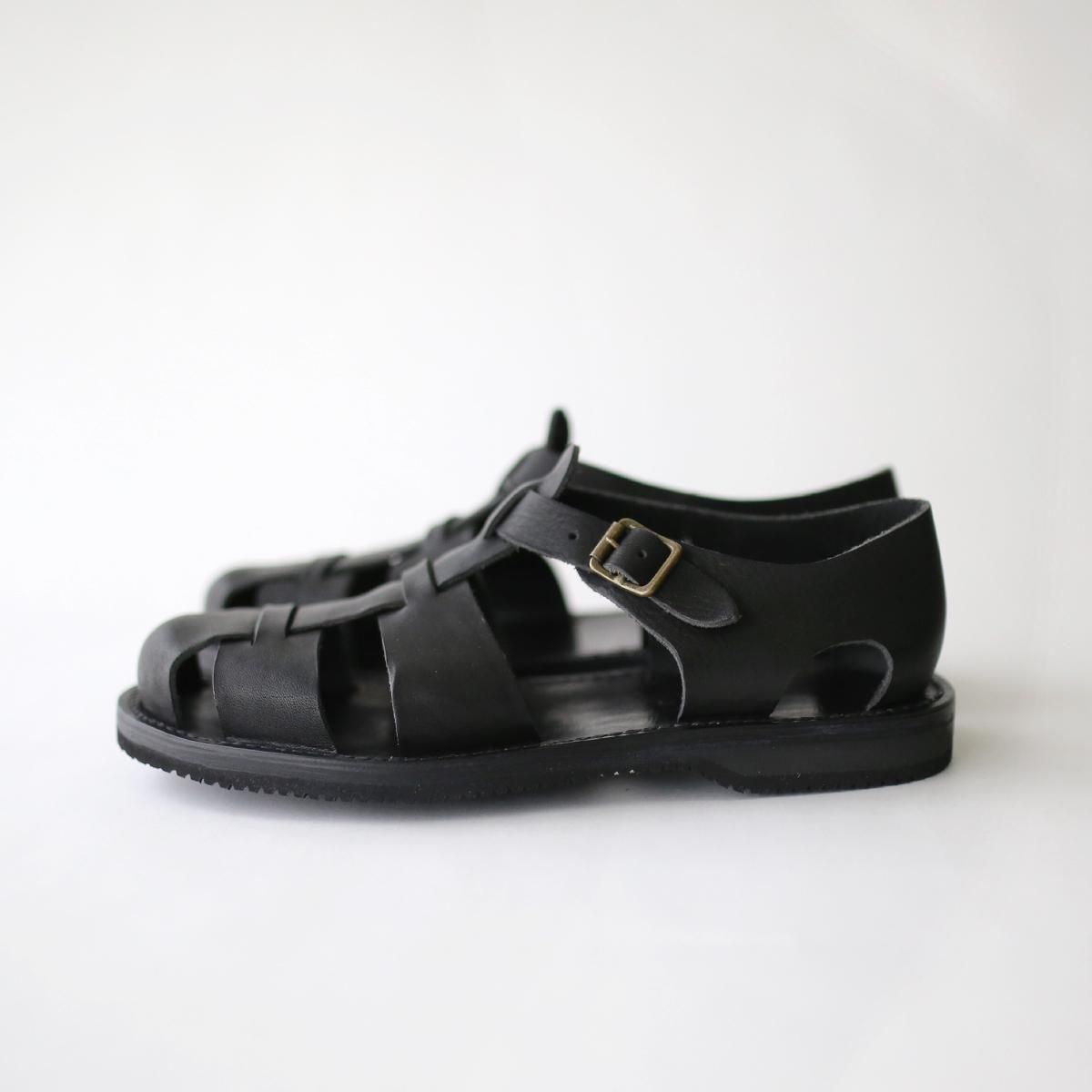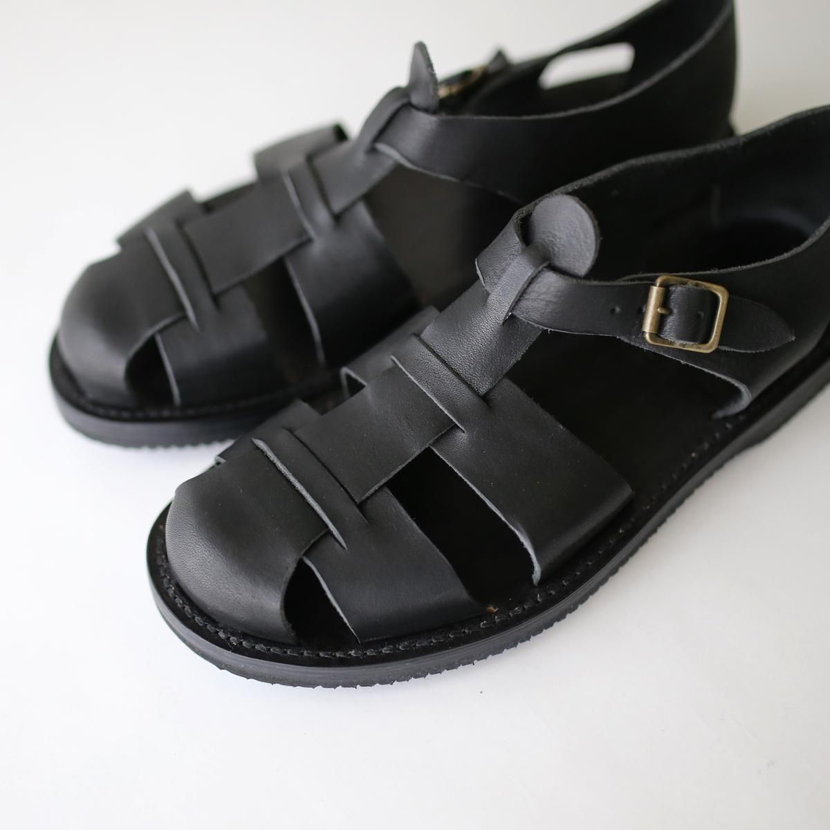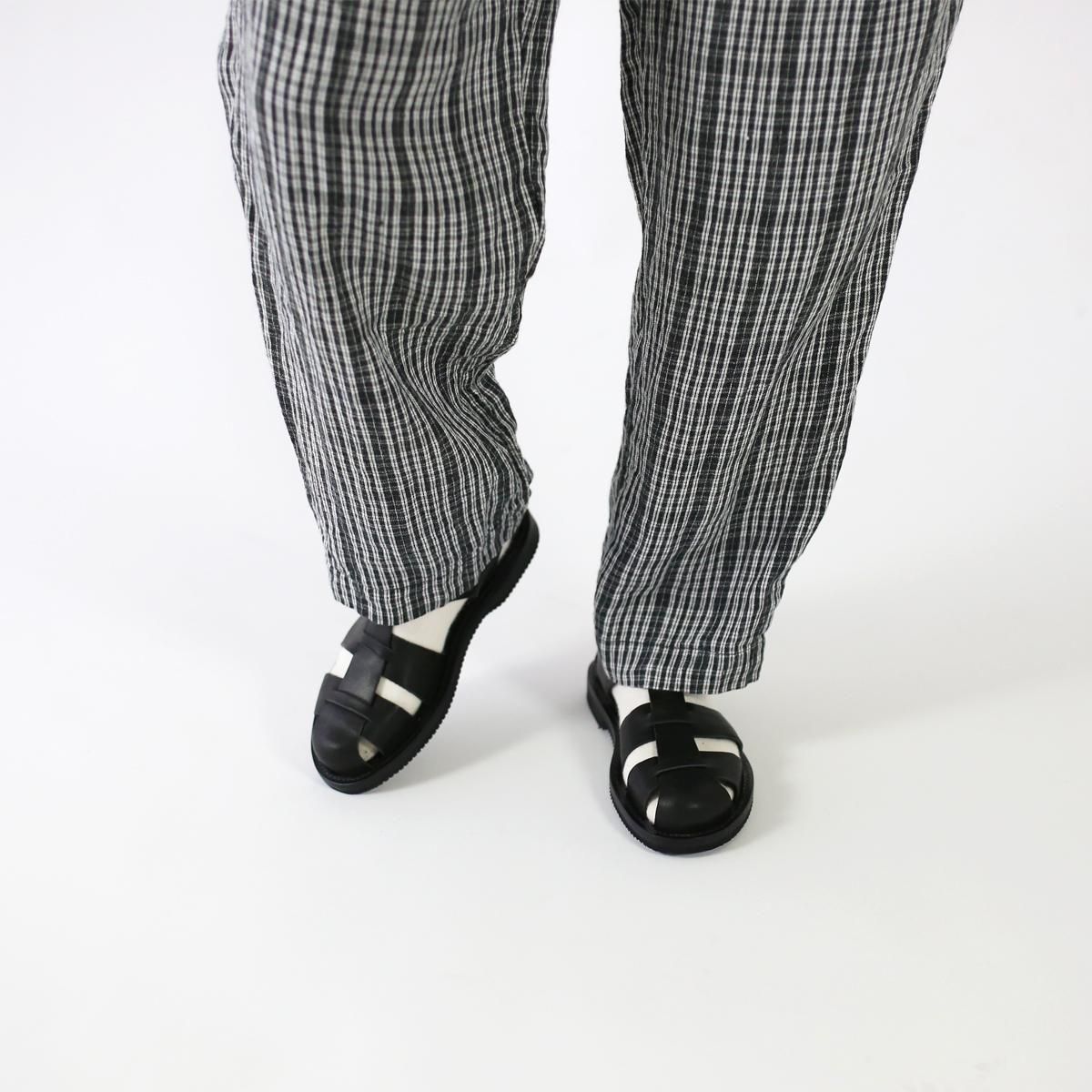 レザーサンダルを素足で履くと足裏にペタペタと張り付くことがありますが、中底面のレザーを船形のように湾曲させることで、この問題を解消。新品の状態からでも足に沿ったフィット感があります。さらに、甲高の足に馴染み易いよう甲部分の革の縁を薄くすき足あたりが優しくストレスなく歩行できます。歩きやすさを考慮して足首から踵は一体型のストラップでホールドされ、しっかりとフィット感があるので長時間履いても疲れにくい仕様です。