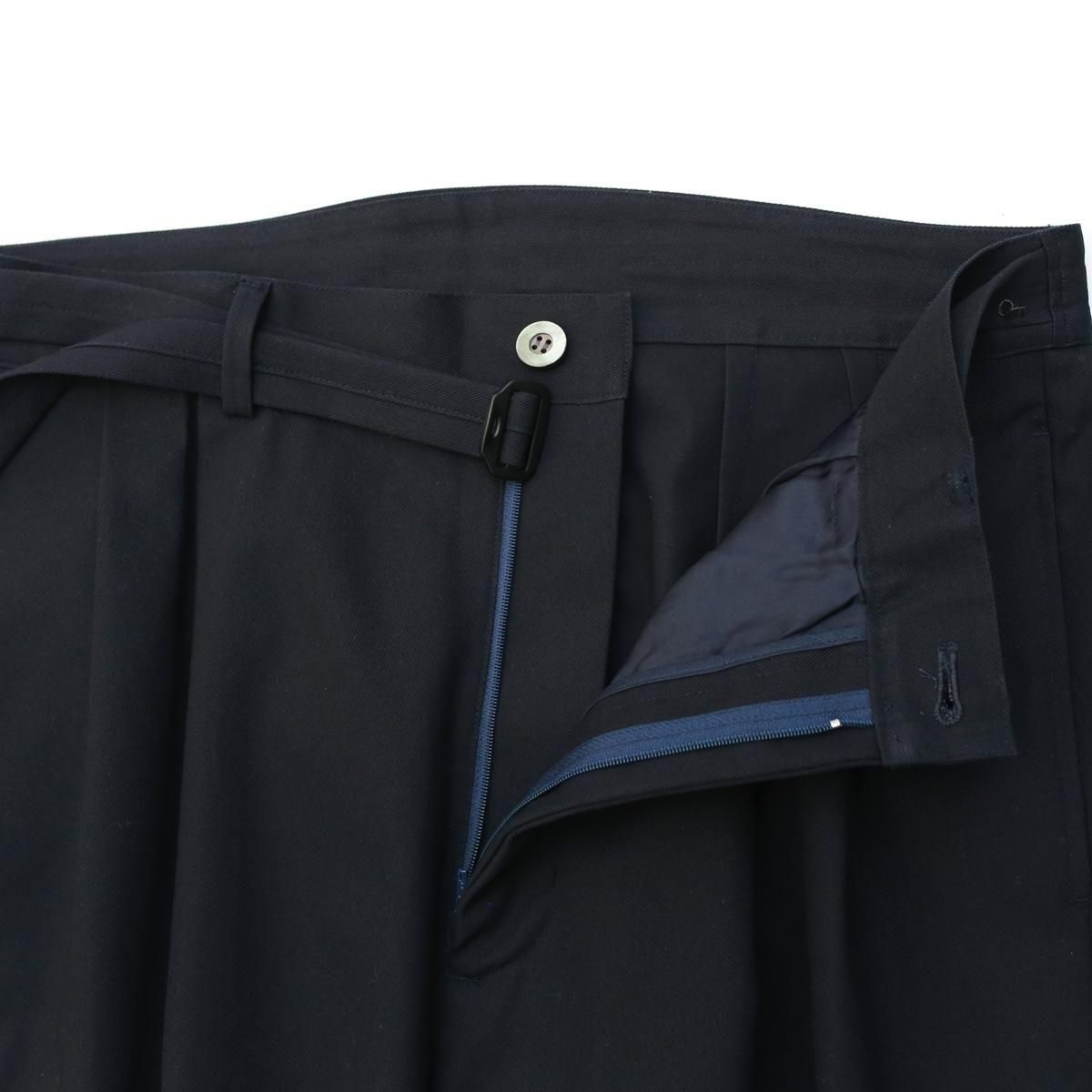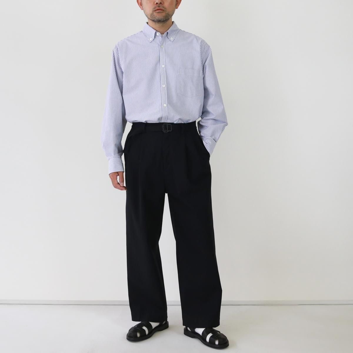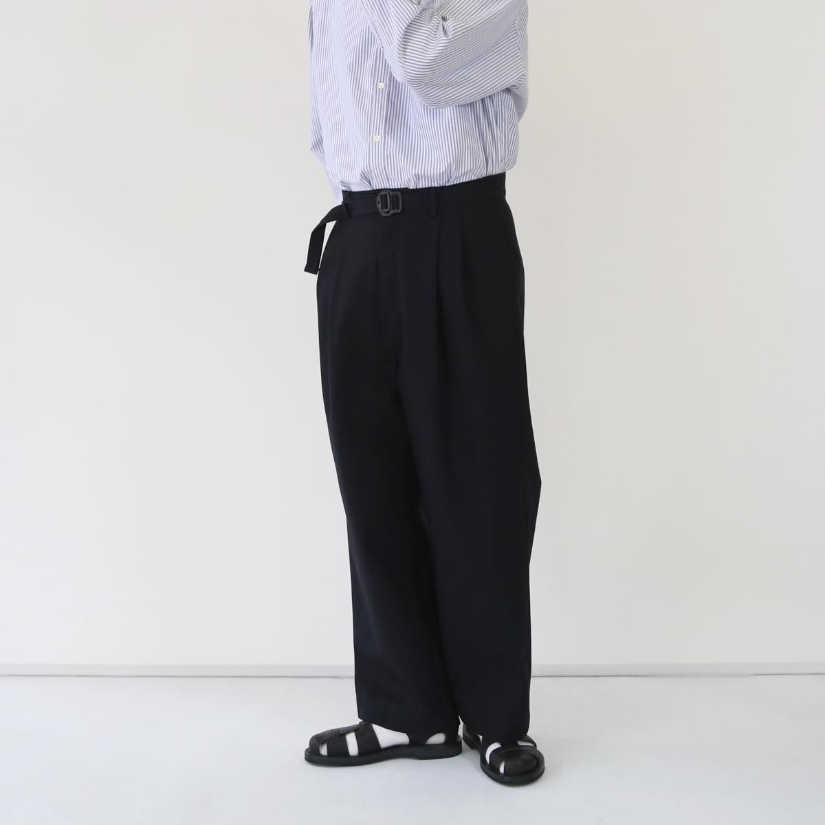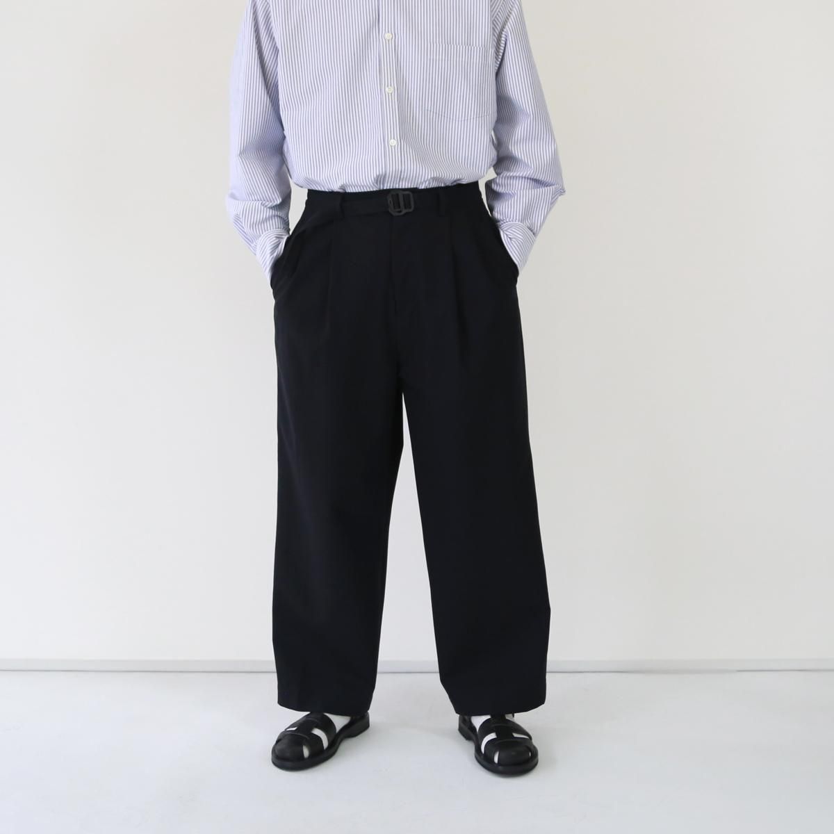 腰まわりはすっきりしていますが、ヒップやもも周りは2タックによって程よいゆとりがあり、そこから裾にかけて緩やかにテーパードします。共生地のベルトがスマートで2タックのボリュームのバランスが良く、タックインスタイルにも適したパンツです。