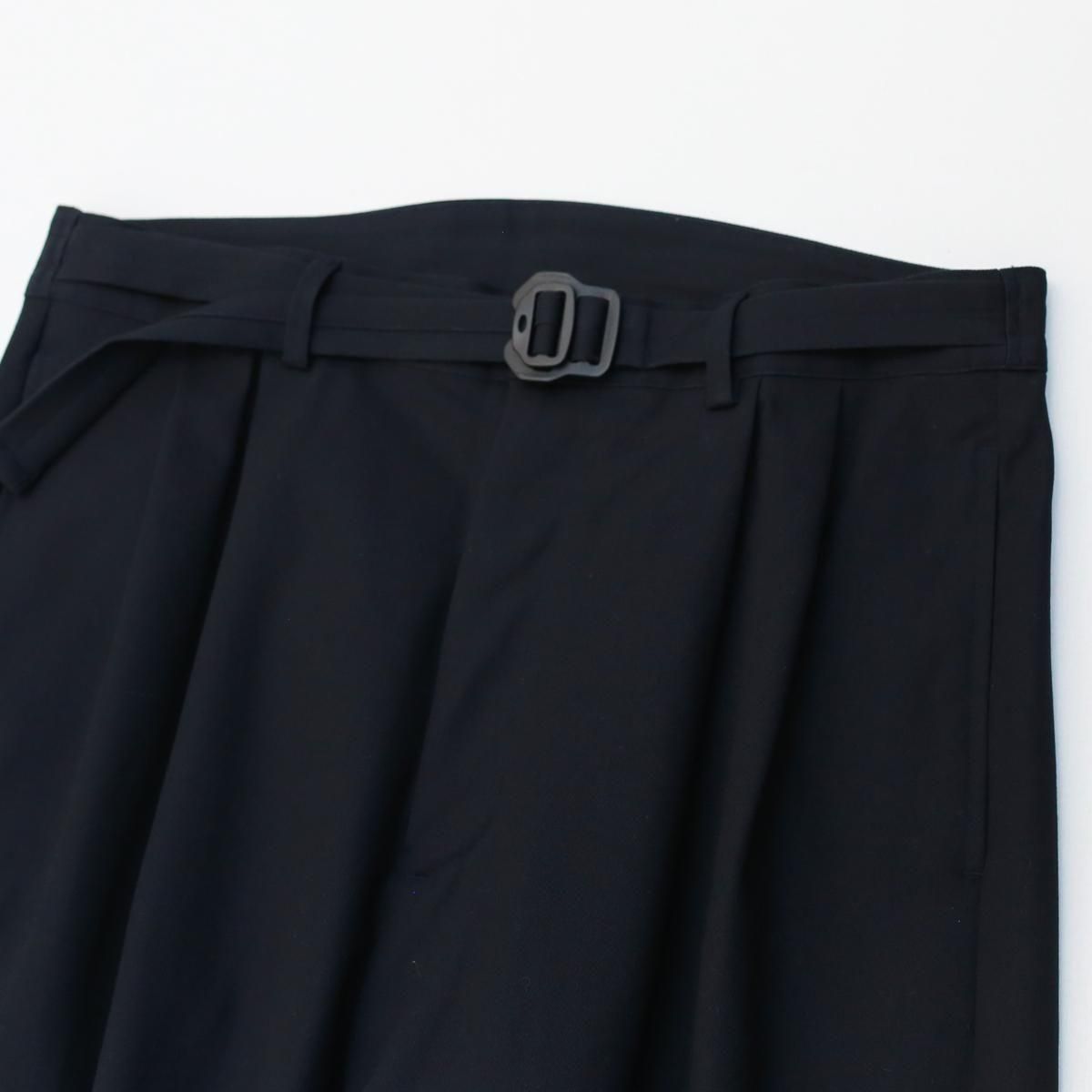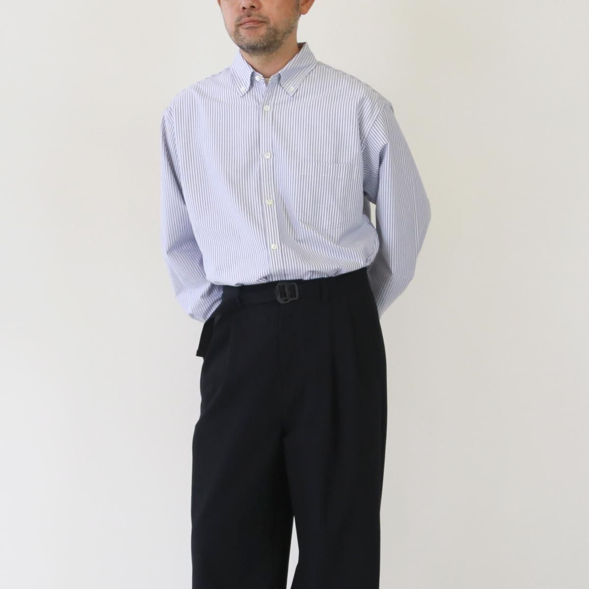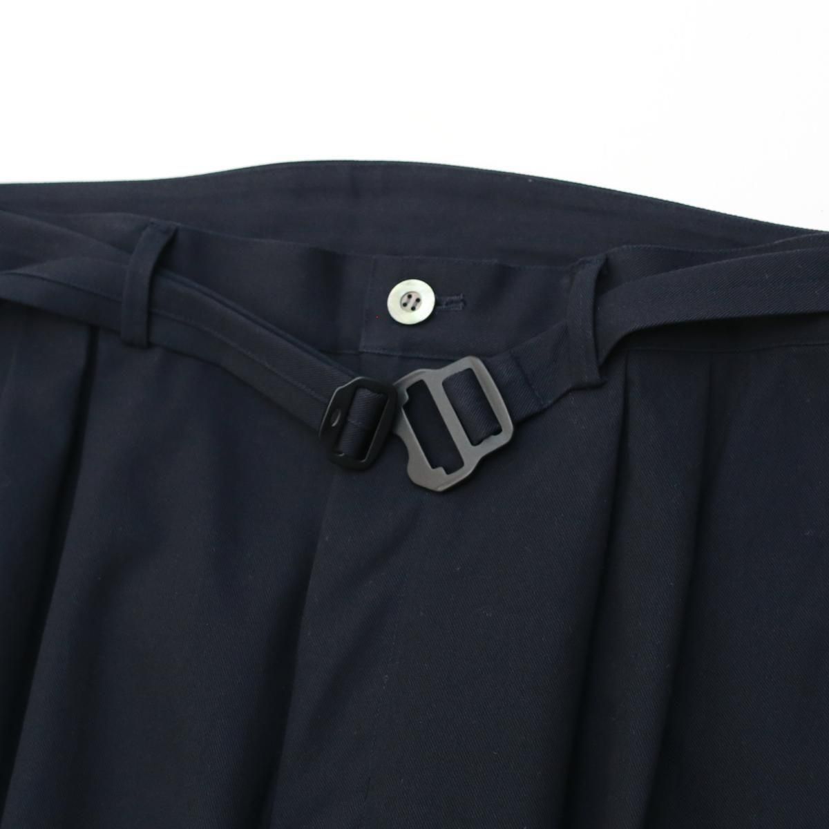 腰まわりはすっきりしていますが、ヒップやもも周りは2タックによって程よいゆとりがあり、そこから裾にかけて緩やかにテーパードします。共生地のベルトがスマートで2タックのボリュームのバランスが良く、タックインスタイルにも適したパンツです。
