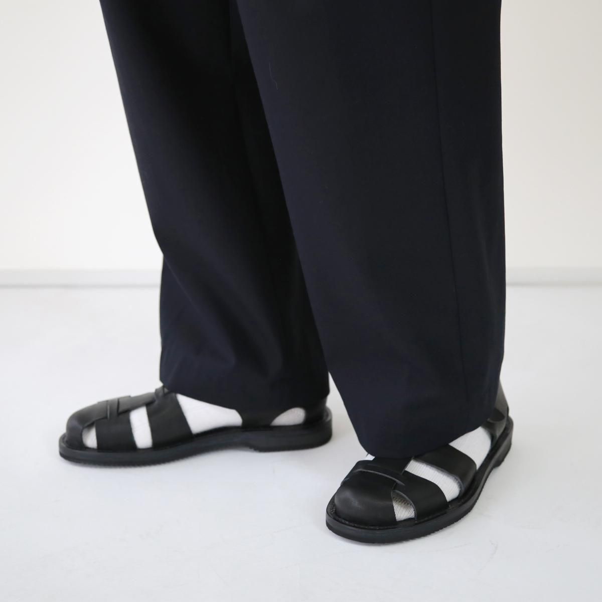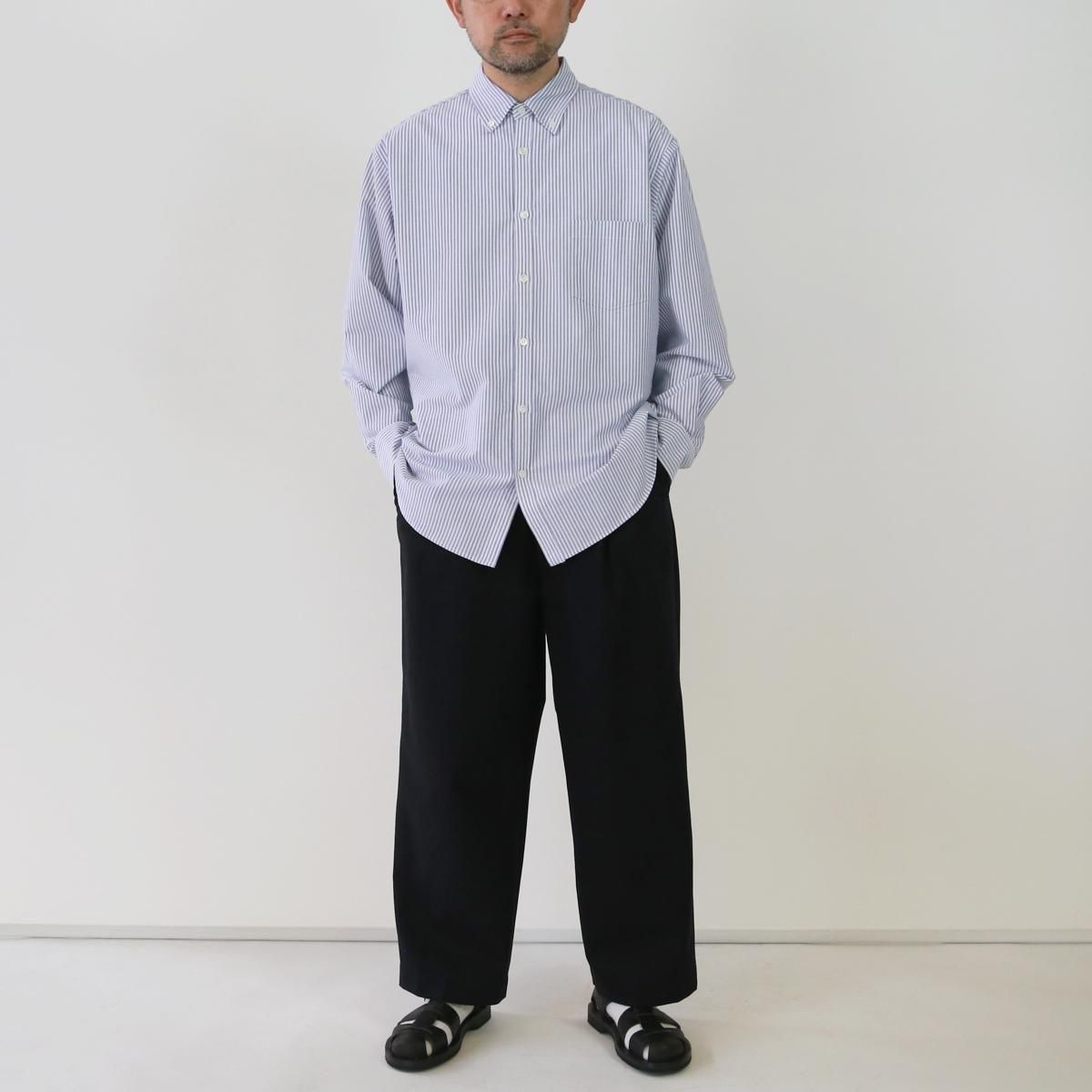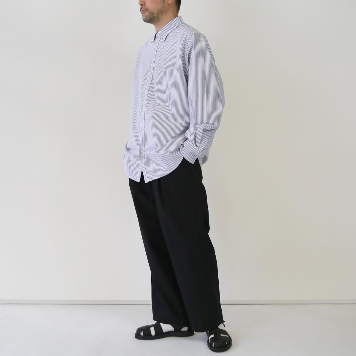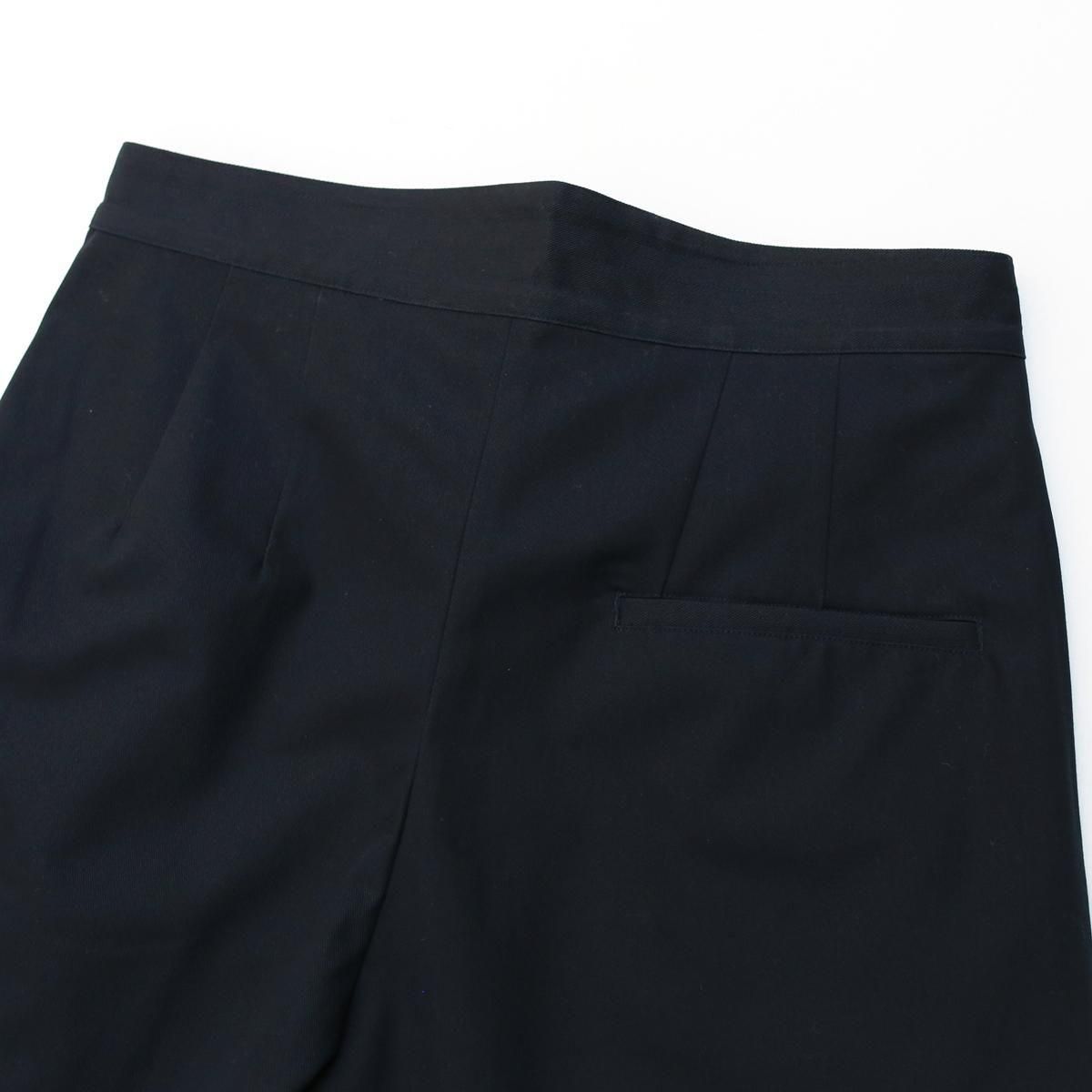 腰まわりはすっきりしていますが、ヒップやもも周りは2タックによって程よいゆとりがあり、そこから裾にかけて緩やかにテーパードします。共生地のベルトがスマートで2タックのボリュームのバランスが良く、タックインスタイルにも適したパンツです。