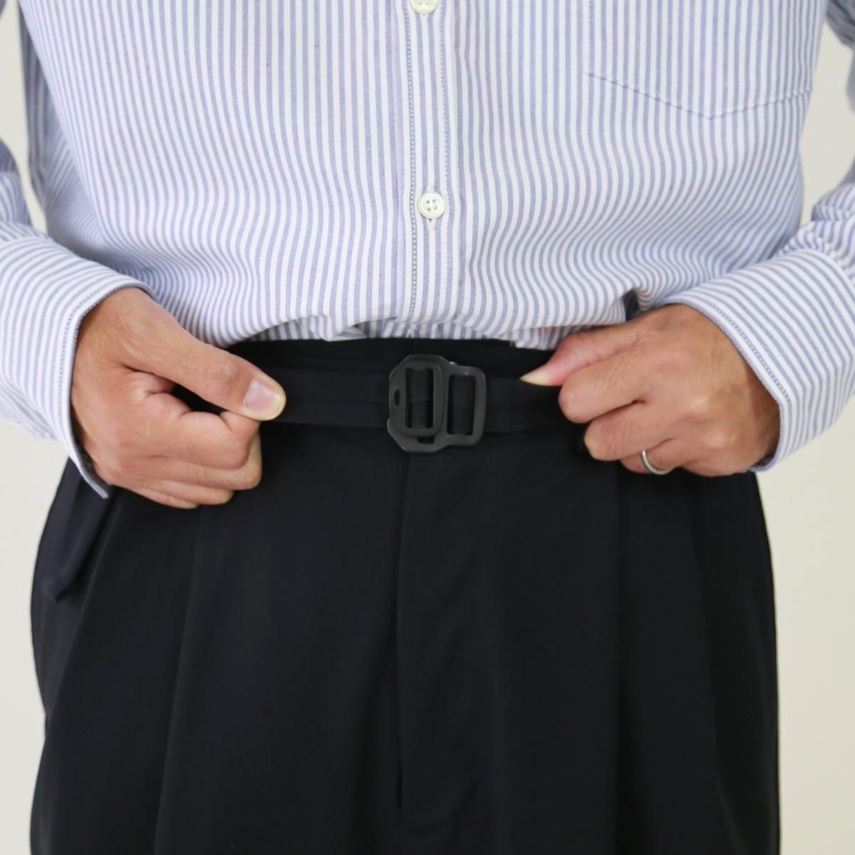オーケストラパンツは、バックル付きのベルトを絞ることでウエストをしっかりホールドできます。付属のバックルは、アメリカのパーツメーカーTRIMMERSの"Alutica-Tilt Head Hip Belt Buckle"。機能性の高さからNASAやアウトドアブランドに採用されています。また、マットなブラックはEEL Products別注カラーです。