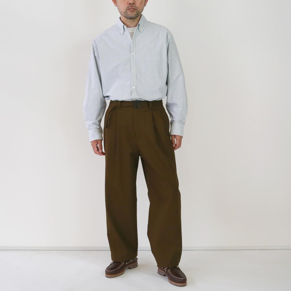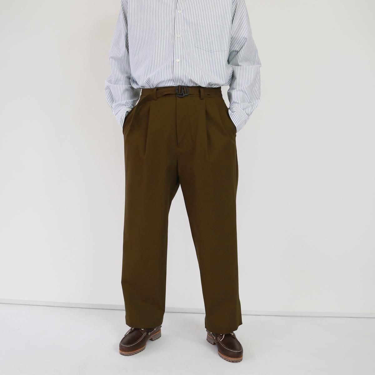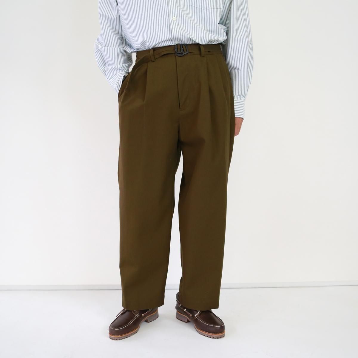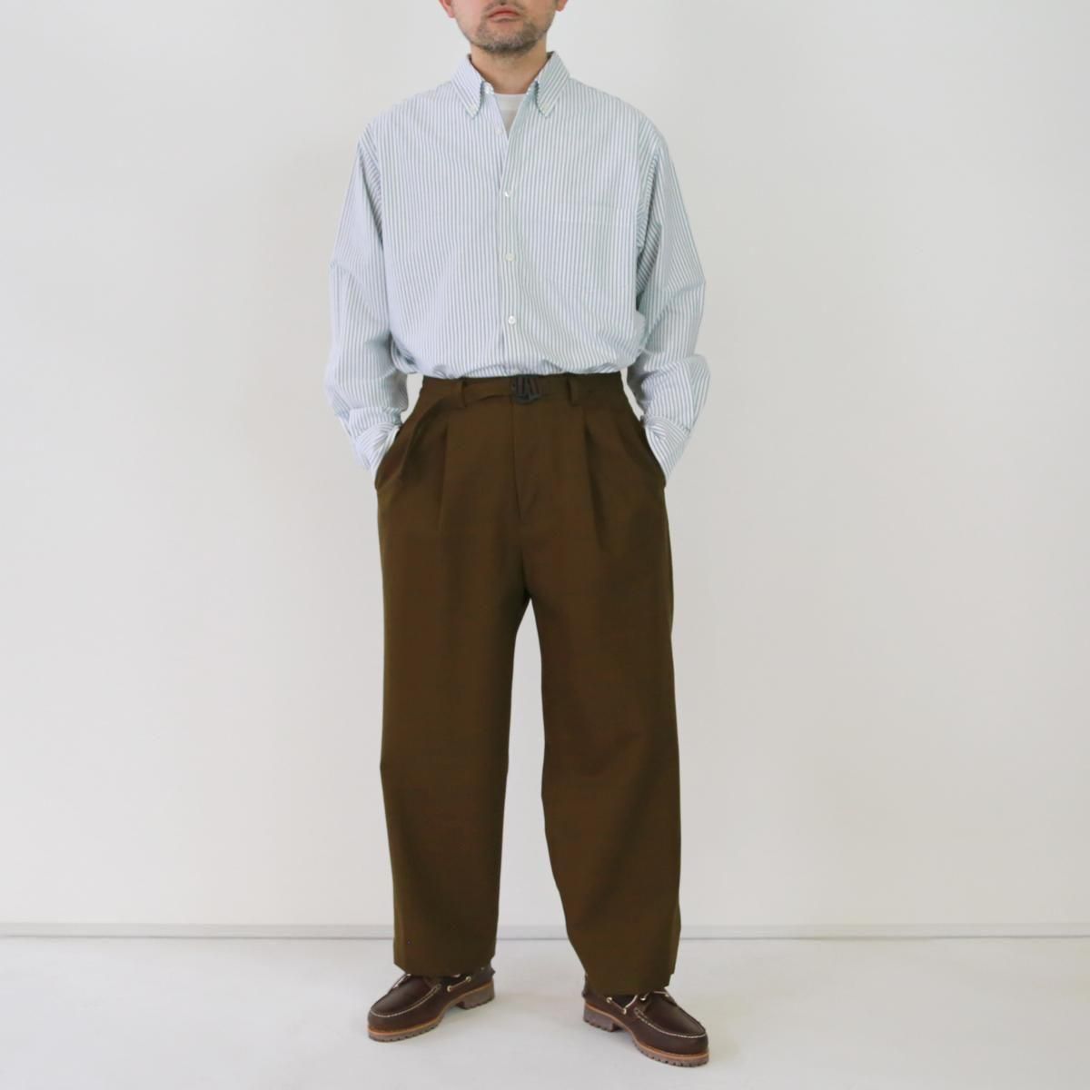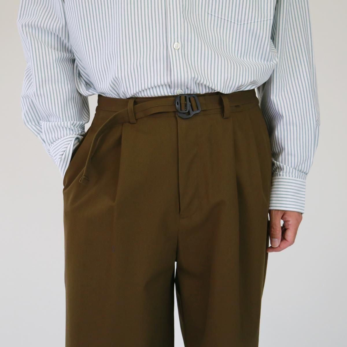 腰まわりはすっきりしていますが、ヒップやもも周りは2タックによって程よいゆとりがあり、そこから裾にかけて緩やかにテーパードします。共生地のベルトがスマートで2タックのボリュームのバランスが良く、タックインスタイルにも適したパンツです。