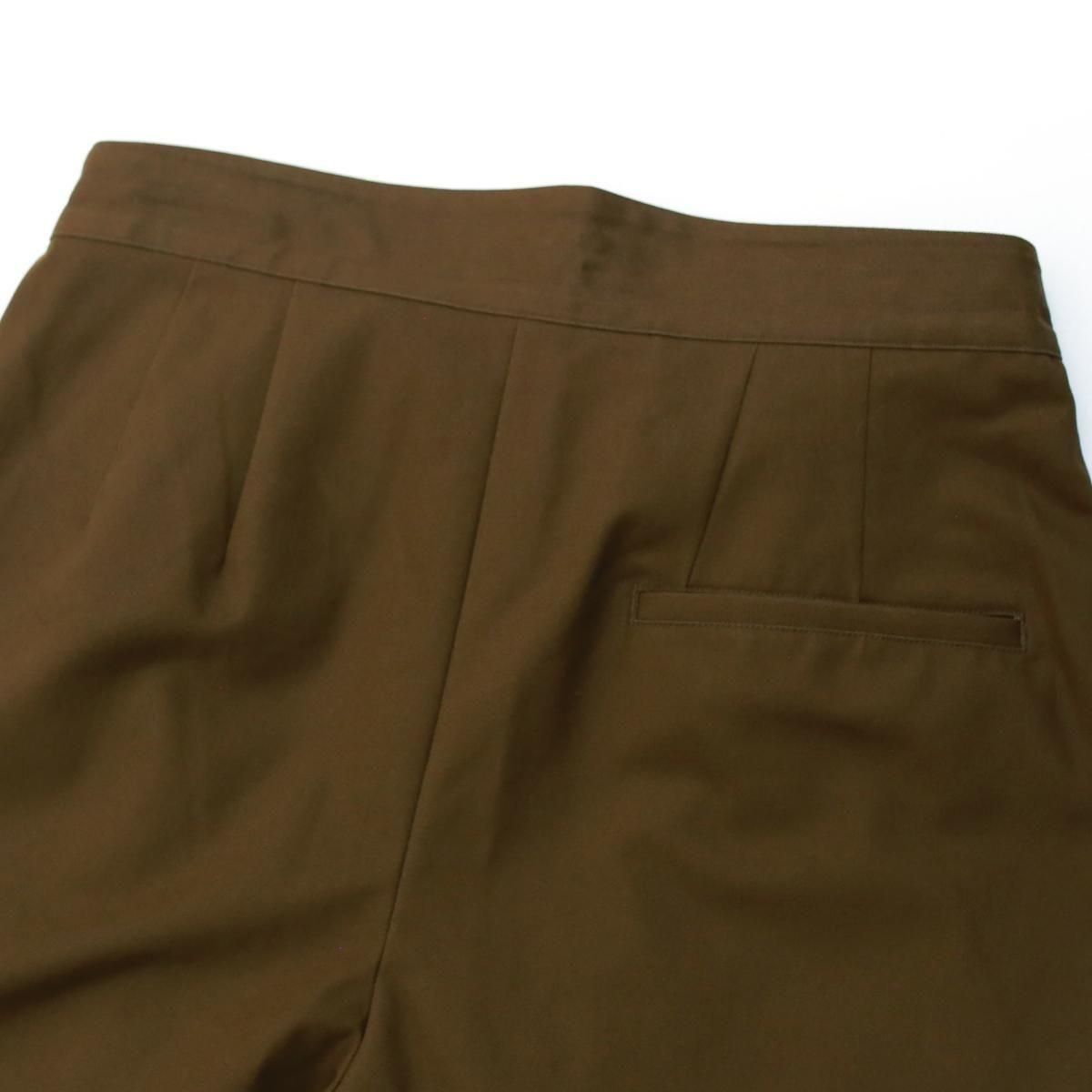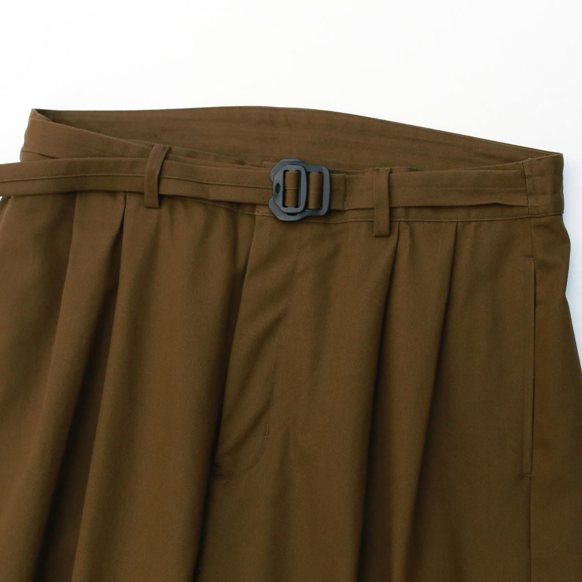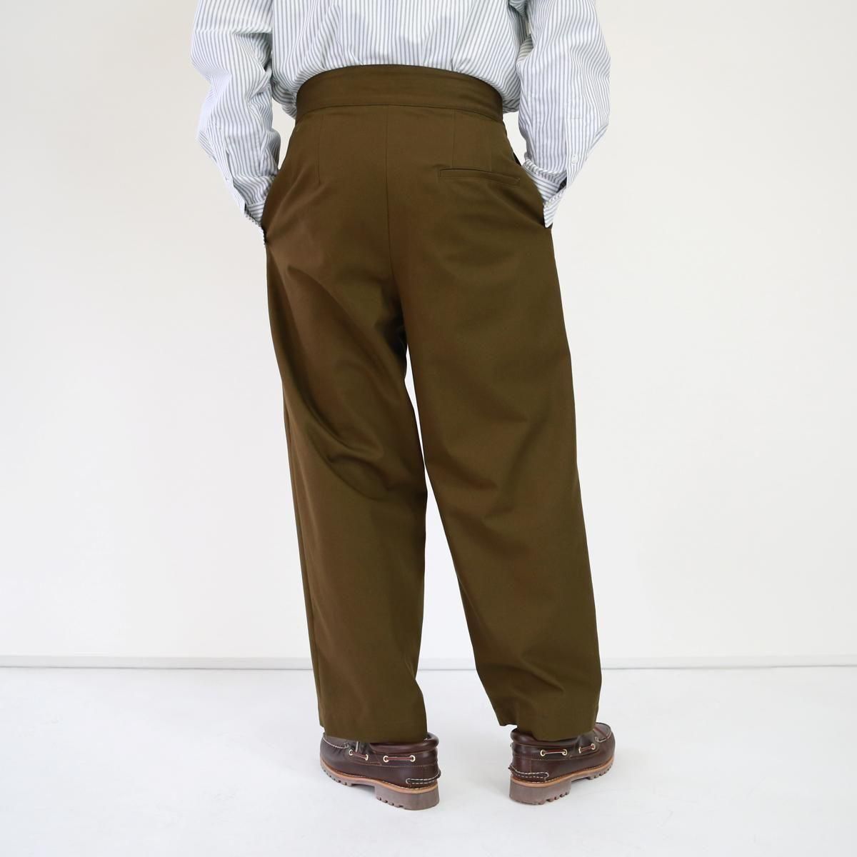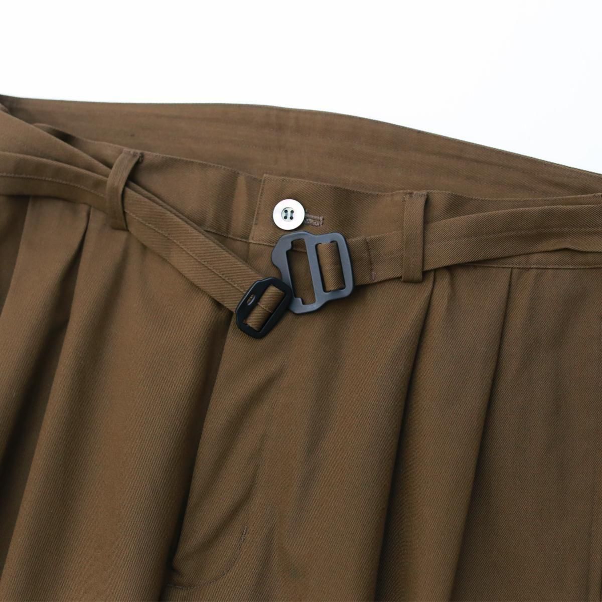 腰まわりはすっきりしていますが、ヒップやもも周りは2タックによって程よいゆとりがあり、そこから裾にかけて緩やかにテーパードします。共生地のベルトがスマートで2タックのボリュームのバランスが良く、タックインスタイルにも適したパンツです。