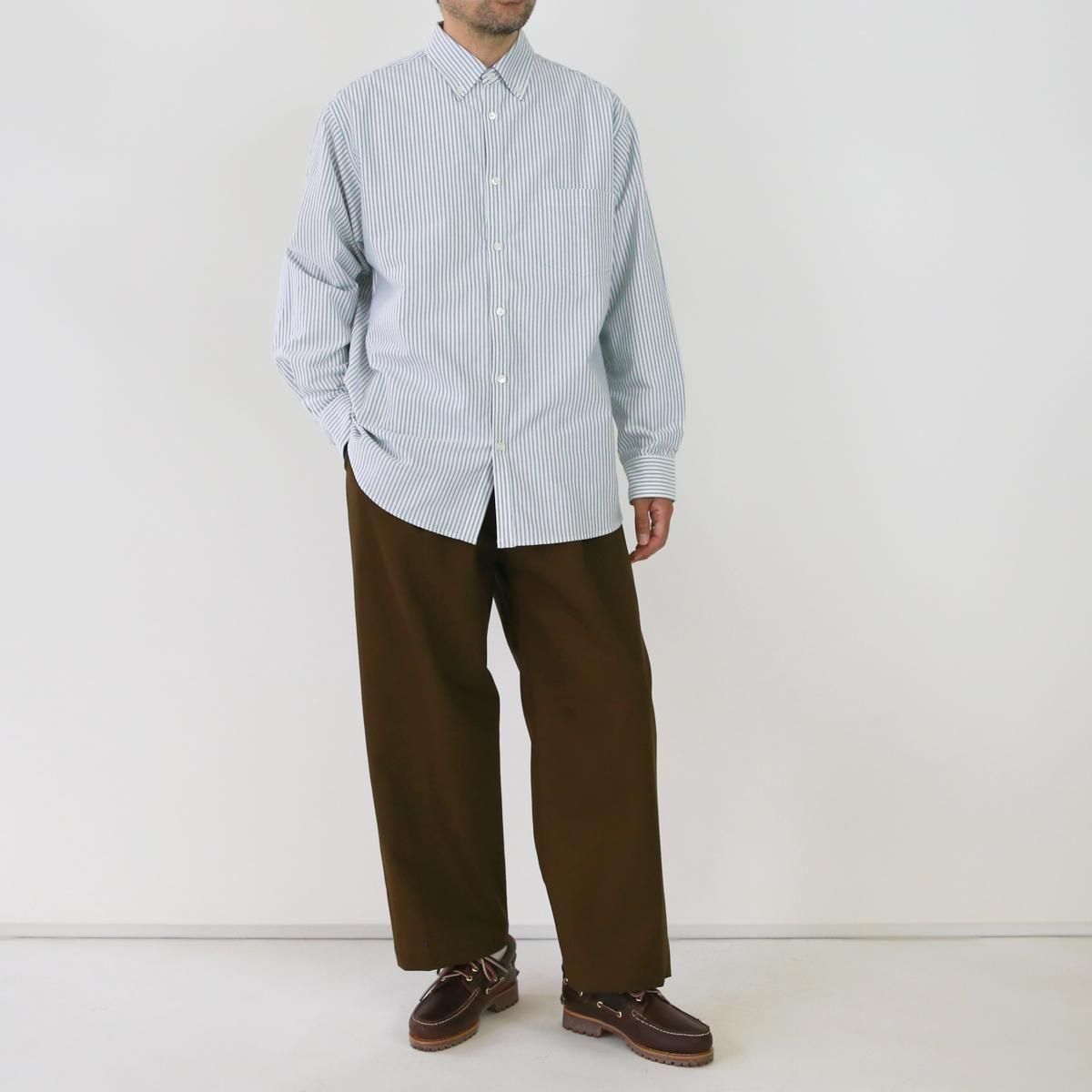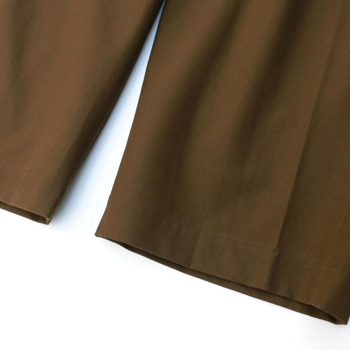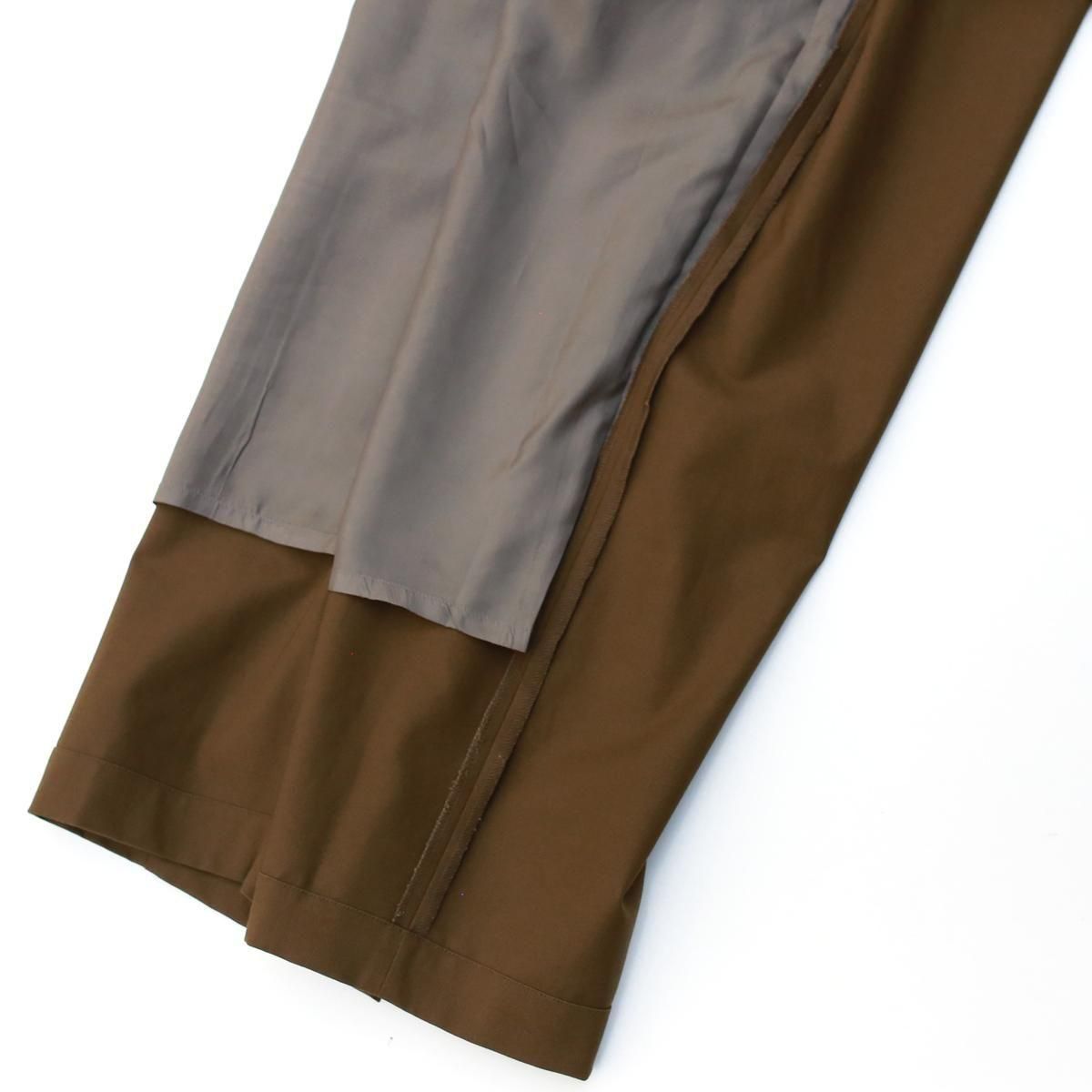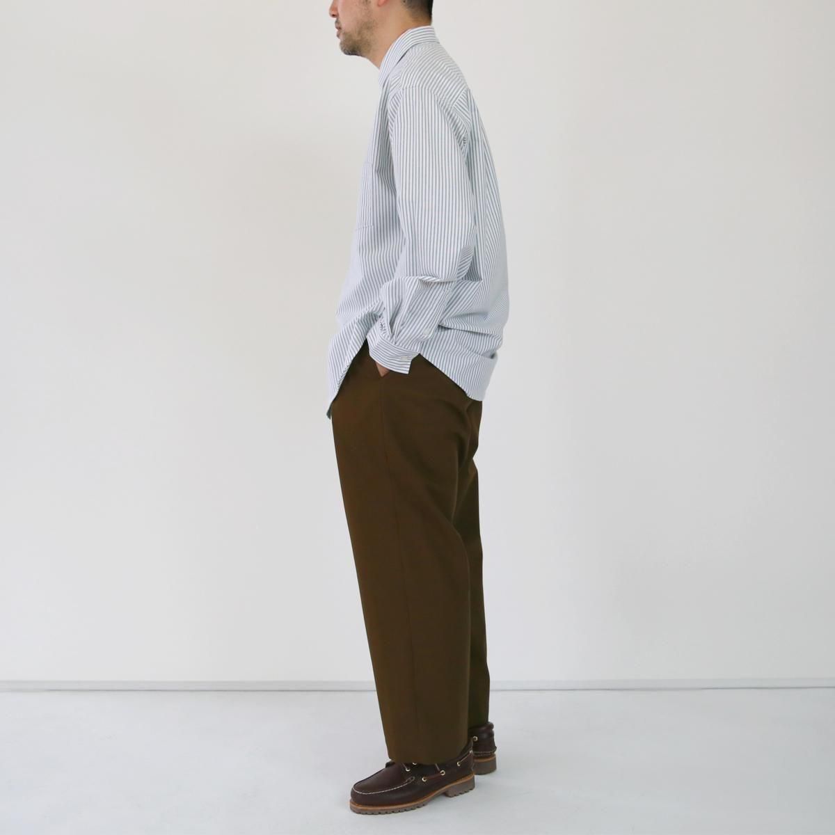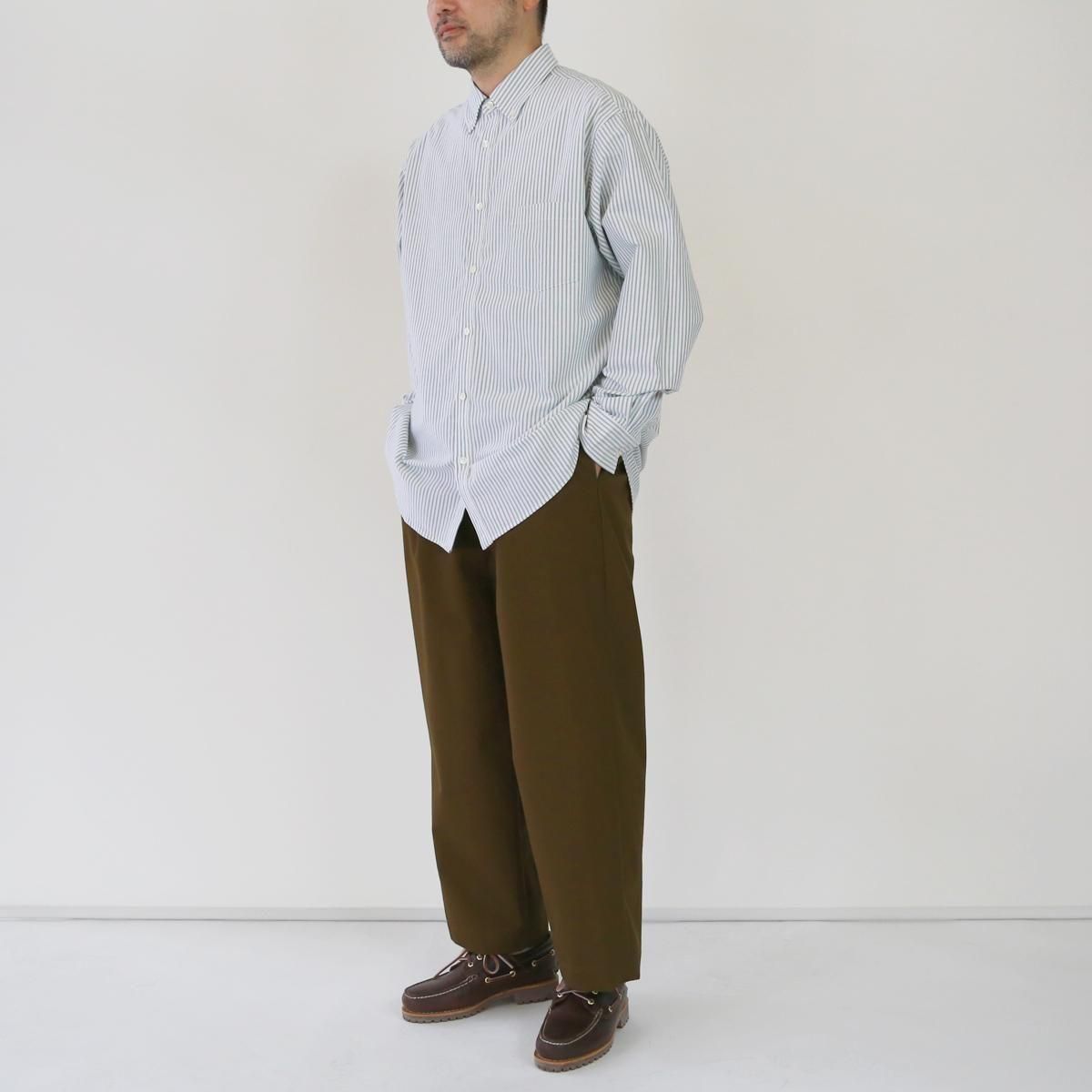 腰まわりはすっきりしていますが、ヒップやもも周りは2タックによって程よいゆとりがあり、そこから裾にかけて緩やかにテーパードします。共生地のベルトがスマートで2タックのボリュームのバランスが良く、タックインスタイルにも適したパンツです。