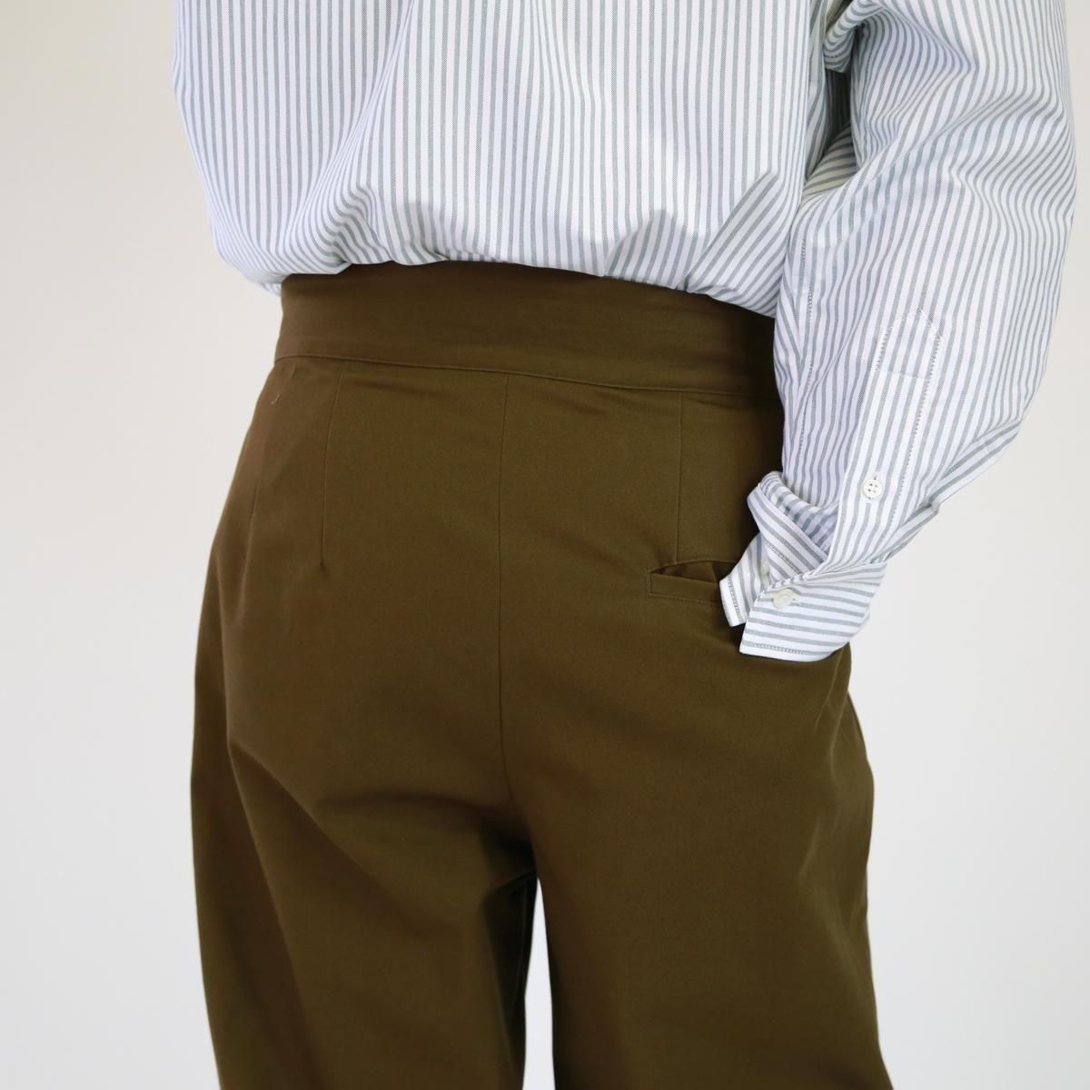 特殊加工を施した生地は、反発性が高くハリコシがある生地で、型崩れしにくく綺麗なシルエットをキープします。また、シワになりにくい嬉しい特徴もあります。厚みのあるしっかりしたコットンツイル生地に、前身だけ裏地を付けることで、滑りの良い穿きやすさと、春、秋、冬の3シーズン着用できる仕様になっています。